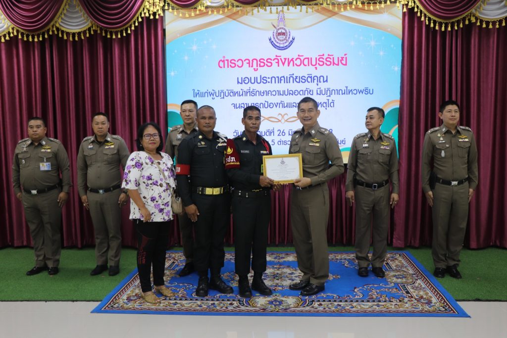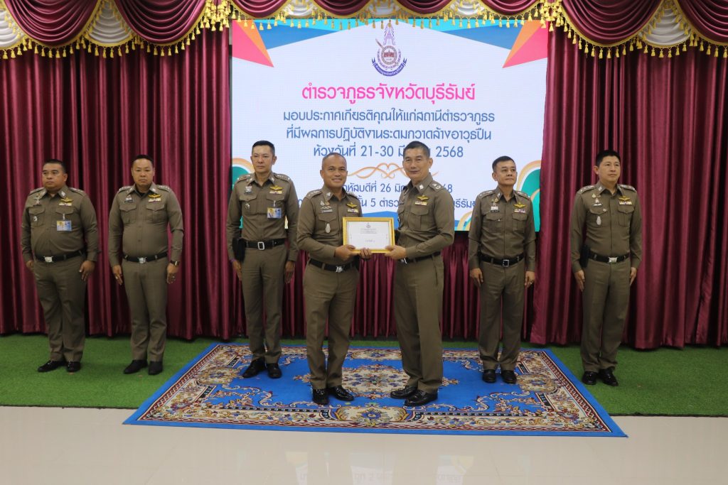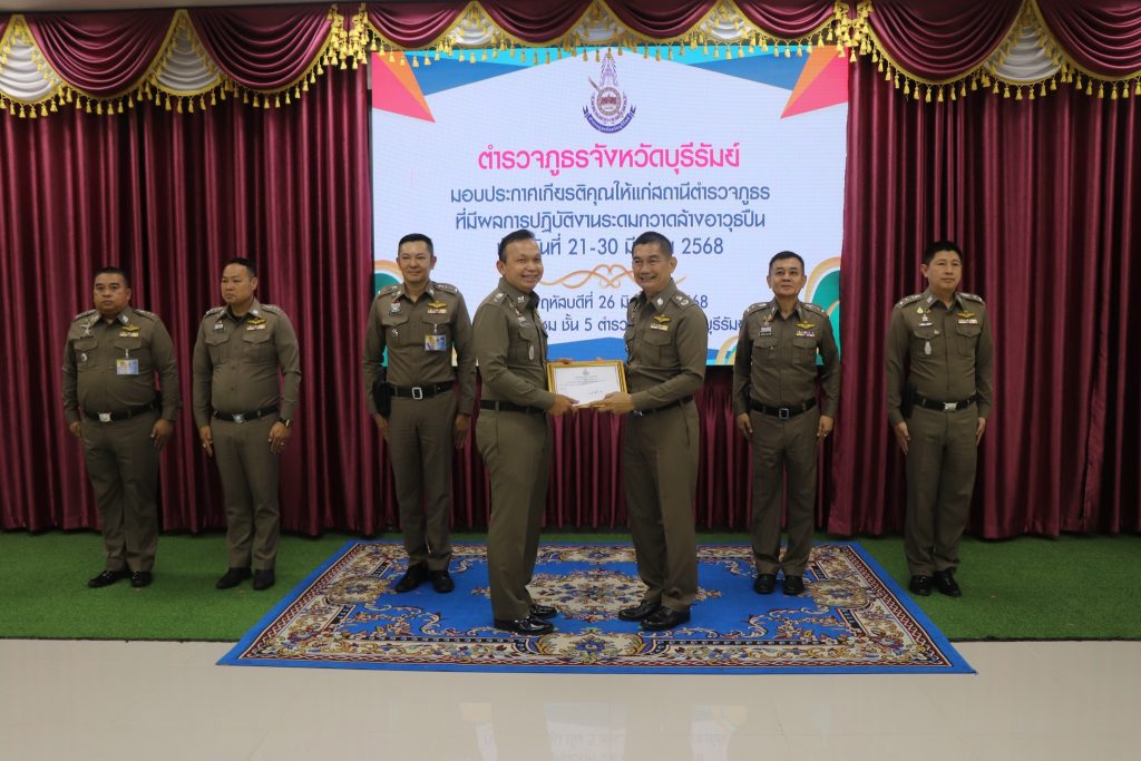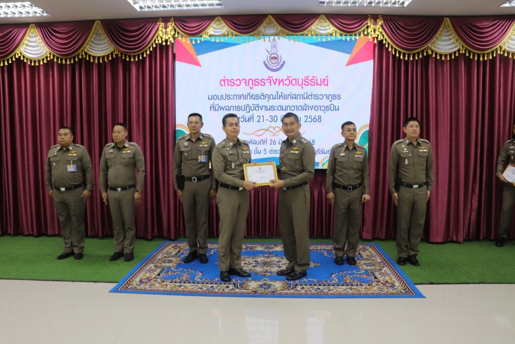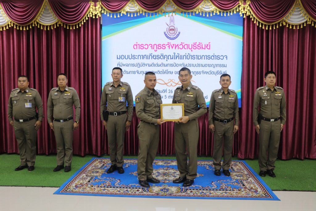 ทั้งนี้ ได้มอบใบประกาศเกียรติคุณให้แก่สถานีตำรวจที่มีผลการปฏิบัติงานระดมกวาดล้างอาวุธปืน , ข้าราชการตำรวจที่มีผลการปฏิบัติงานดีเด่นสายงานป้องกันปราบปราม , ข้าราชการตำรวจที่ช่วยเหลือประชาชนและผู้ปฏิบัติหน้าที่รักษาความปลอดภัย ณ ห้องประชุมชั้น 5 ตำรวจภูธรจังหวัดบุรีรัมย์