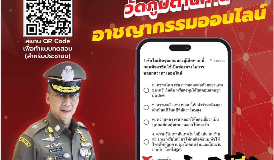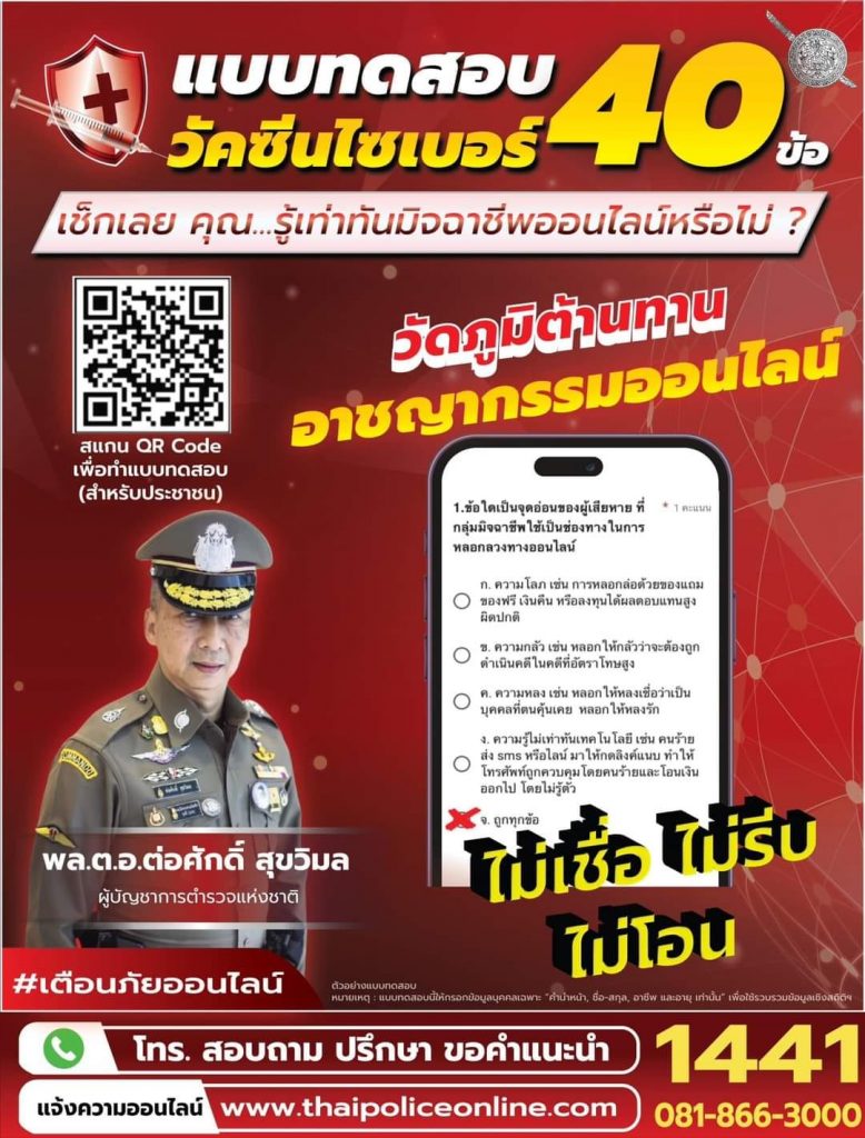 ขอประชาสัมพันธ์ ระบบทดสอบวัคซีนไซเบอร์ ข้อสอบ 40 ข้อ เพื่อเพิ่มความสามารถในการป้องกันภัยอาชญากรรมทางเทคโนโลยีให้กับประชาชน ตามลิงก์ใหม่ ที่ลงทะเบียนผ่านไลน์ (โดยไม่ใช้เลขหลังบัตร) ที่แนบมาพร้อมนี้ สามารถใช้เป็นเครื่องมือในการนำไปสื่อสารกับประชาชน นักเรียน นักศึกษา ในการลงพื้นที่ทำงาน สร้างภูมิคุ้มกันต้านภัยอาชญากรรมทางไซเบอร์ https://cybervaccine.maejowisdom.com/