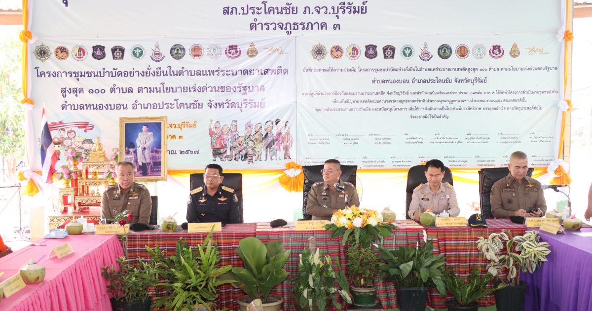 โดยมี พล.ต.ต.รุทธพล เนาวรัตน์ ผบก.ภ.จว.บุรีรัมย์, นายปิยะ ปิจนำ รองผู้ว่าราชการจังหวัดบุรีรัมย์, พ.ต.อ.ก้องชาติ เลี้ยงสมทรัพย์ รอง ผบก.ภ.จว.บุรีรัมย์, นายกิติพัฒน์ กะวัง นายอำเภอประโคนชัย, พ.ต.อ.วิษณุ อาภรณ์พงษ์ ผกก.สภ.ประโคนชัย, พ.ต.อ.อัษฎไณย ป้องกัน ผกก.สภ.ลำดวน อ.กระสัง จ.บุรีรัมย์, เจ้าหน้าที่ชุดปฏิบัติการโครงการฯสภ.ประโคนชัย, สาธารณสุขอำเภอประโคนชัย, ผู้นำชุมชน, คณะกรรมการคุ้ม และประชาชนในพื้นที่ ร่วมให้การต้อนรับ ณ ศูนย์การเรียนรู้ปรัชญาเศรษฐกิจพอเพียงบ้านห้วยเสลา ต.หนองบอน อ.ประโคนชัย จ.บุรีรัมย์