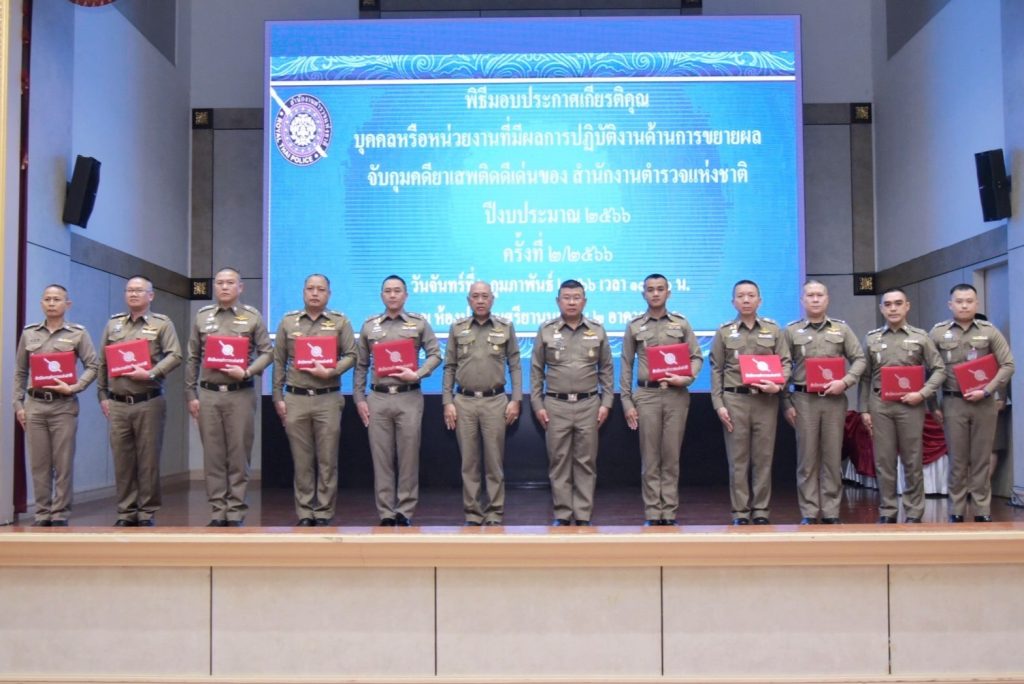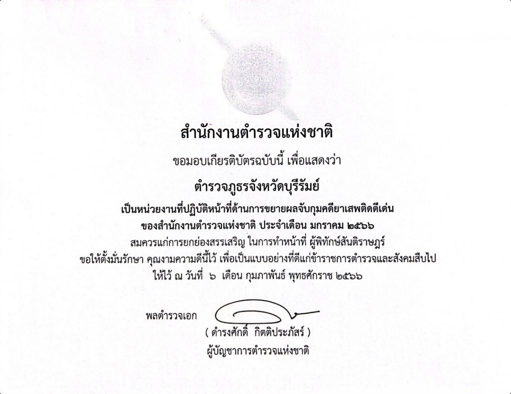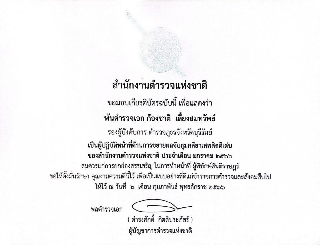 2)ประเภทบุคคลได้แก่ “พ.ต.อ.ก้องชาติ เลี้ยงสมทรัพย์ รอง ผบก.ภ.จว.บุรีรัมย์ เป็นผู้ปฏิบัติหน้าที่ด้านการขยายผลจับกุมยาเสพติดดีเด่น ของ ตร.ประจำเดือน ม.ค.2566” โดยมี พล.ต.อ.ดำรงศักดิ์ กิตติประภัสร์ ผบ.ตร. เป็นประธานในพิธี