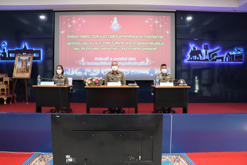 วันที่ 6 กุมภาพันธ์ 2566 พล.ต.ต.รุทธพล เนาวรัตน์ ผบก.ภ.จว.บุรีรัมย์ พร้อมด้วย พ.ต.อ.วรายุส์ จันทร์เยี่ยม รอง ผบก.ฯ ปรก.ภ.จว.บุรีรัมย์, พ.ต.อ.หญิง รุ่งรัตน์ ศีลสารรุ่งเรือง ผกก.ฝตส.3 ตส.1, พ.ต.อ.สาธิต สถิตถาวร ผกก.สืบสวน ภ.จว.บุรีรัมย์ และเจ้าหน้าที่ที่เกี่ยวข้อง ร่วมประชุมเปิดการตรวจสอบอาวุธปืนคงคลังของทางราชการฯ ประจำปีงบประมาณ พ.ศ.2566 ในสังกัด ภ.จว.บุรีรัมย์ ผ่านระบบ (Video Conference) โดยมี พล.ต.ต.สมพจน์ ขอมปรางค์