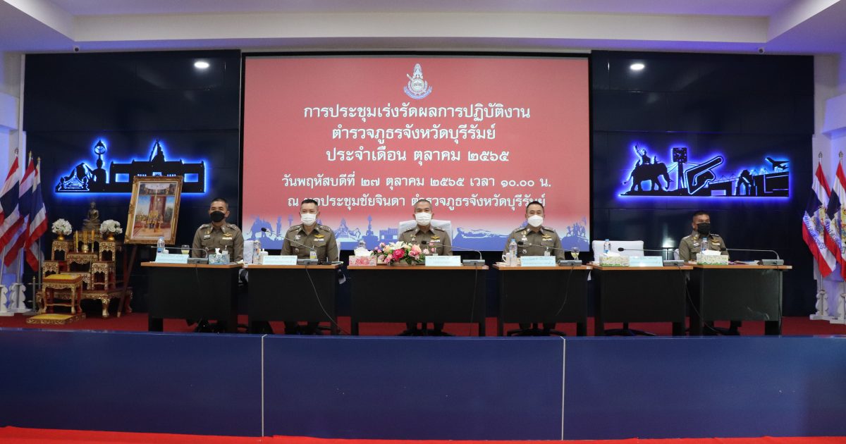 วันที่ 27 ต.ค.65 เวลา 10.00 น. พล.ต.ต.รุทธพล เนาวรัตน์ ผบก.ภ.จว.บุรีรัมย์ เป็นประธานการประชุมเร่งรัดผลการปฏิบัติงานตำรวจภูธรจังหวัดบุรีรัมย์ ประจำเดือน ตุลาคม 2565 พร้อมด้วย พ.ต.อ.วรายุส์ จันทร์เยี่ยม รอง ผบก.ฯ ปรก.ภ.จว.บุรีรัมย์,พ.ต.อ.ปริญญา พรเดชาพิพัฒ รอง ผบก.ภ.จว.บุรีรัมย์,พ.ต.อ.ก้องชาติ เลี้ยงสมทรัพย์ รอง ผบก.ภ.จว.บุรีรัมย์,พ.ต.อ.นิรันดร์ แก้วอิน รอง ผบก.ภ.จว.บุรีรัมย์,ผกก.ฝอ.ภ.จว.บุรีรัมย์, ผกก.สืบสวน กก.สืบสวน ภ.จว.บุรีรัมย์, ผกก.(สอบสวน) ภ.จว.บุรีรัมย์, หัวหน้า สภ. ในสังกัด, ข้าราชการตำรวจฝ่ายอำนวยการ ภ.จว.บุรีรัมย์ และผู้ที่มีส่วนเกี่ยวข้อง ร่วมประชุม ฯ พร้อมนี้ได้มอบทุนส่งเสริมการศึกษาให้แก่บุตรสมาชิกสหกรณ์ออมทรัพย์ตำรวจจังหวัดบุรีรัมย์ จำกัด จำนวน 14 คน มอบใบประกาศเกียรติคุณเพื่อยกย่องเชิดชูเกียรติเป็นขวัญและกำลังใจให้กับผู้ใต้บังคับบัญชา ที่มีผลการปฏิบัติงานดีเด่น ด้านการป้องกันปราบปรามอาชญากรรม ของ ตำรวจภูธรจังหวัดบุรีรัมย์ และข้าราชการตำรวจที่มีผลการปฏิบัติงานดีเด่น ด้านการป้องกันปราบปรามยาเสพติดดีเด่น ระดับ ภ.3 จำนวน 50 นาย ณ หอประชุมชัยจินดา ภ.จว.บุรีรัมย์