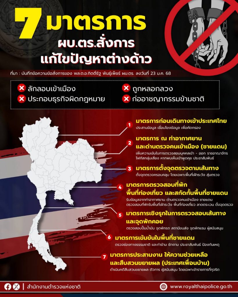 วันที่ 25 มกราคม 2568 พล.ต.อ.กิตติ์รัฐ พันธุ์เพ็ชร์ ผู้บัญชาการตำรวจแห่งชาติ เปิดเผยว่า สำนักงานตำรวจแห่งชาติมุ่งมั่นในการแก้ไขปัญหาคนต่างด้าวที่หลบหนีเข้าเมืองโดยผิดกฎหมาย คนต่างด้าวตั้งกลุ่มแก๊งกระทำความผิดหรือประกอบธุรกิจผิดกฎหมาย และอาชญากรรมข้ามชาติ อย่างเต็มกำลัง เพื่อขจัดปัญหาเหล่านี้ให้หมดไปโดยเร็ว จึงได้มีหนังสือสั่งการเน้นย้ำให้หน่วยปฏิบัติที่เกี่ยวข้อง บังคับใช้ 7 มาตรการ อย่างเข้มงวด ในการป้องกันและแก้ไขปัญหา ได้แก่