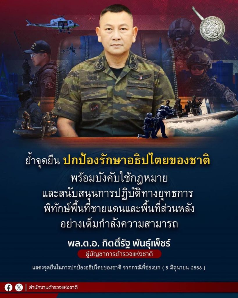 ผู้บัญชาการตำรวจแห่งชาติย้ำจุดยืนในการปกป้องรักษาอธิปไตยของชาติ จะไม่ให้ผู้ใดล่วงล้ำอธิปไตยของชาติไทยอย่างเด็ดขาด พร้อมบังคับใช้กฎหมายและสนับสนุนการปฏิบัติทางยุทธการ พิทักษ์พื้นที่ชายแดนและพื้นที่ส่วนหลังอย่างเต็มกำลังความสามารถ