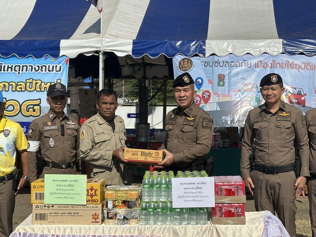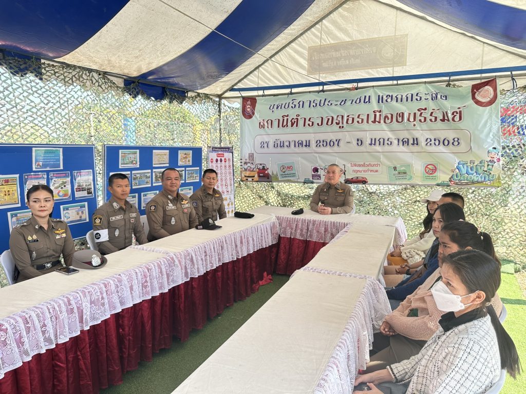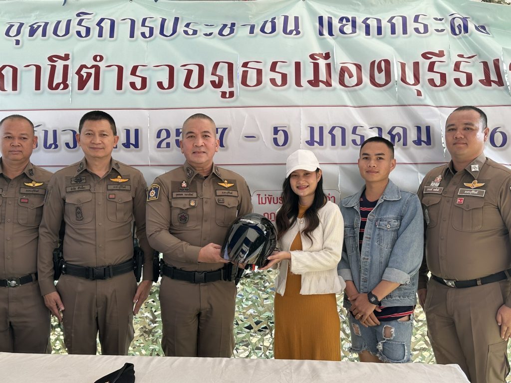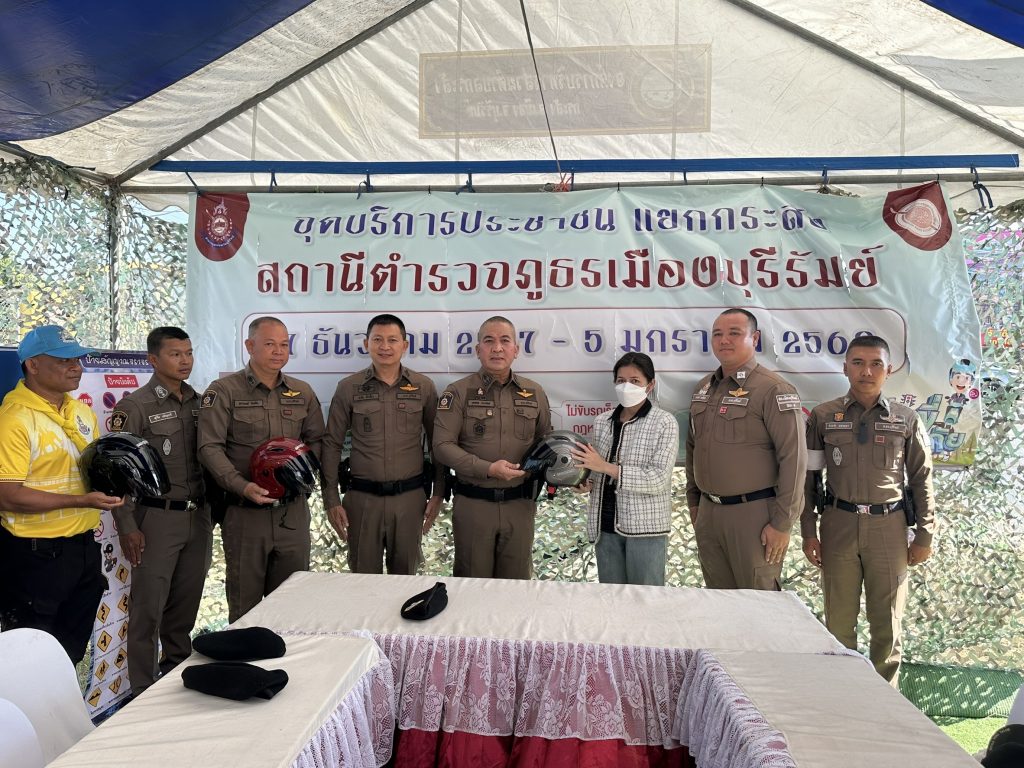 วันที่ 31 ธันวาคม 2567 เวลา 10.00 น. พล.ต.ต.รุทธพล เนาวรัตน์ ผบก.ภ.จว.บุรีรัมย์ ได้เดินทางมาตรวจเยี่ยมจุดบริการประชาชน สภ.เมืองบุรีรัมย์ ในช่วงเทศกาลปีใหม่ พ.ศ.2568 พบ พ.ต.อ.จำรัส ศิริเลี้ยง ผกก.สภ.เมืองบุรีรัมย์, เจ้าหน้าที่ตำรวจ, ฝ่ายปกครอง, สาธารณสุข และเจ้าหน้าที่ในส่วนที่เกี่ยวข้องอยู่ปฏิบัติหน้าที่ พร้อมได้กำชับการปฏิบัติหน้าที่ในการบริการประชาชนและอำนวยความสะดวกด้านการจราจรให้เป็นไปด้วยความเรียบร้อย ใช้กิริยาวาจาด้วยความสุภาพ ในการนี้ได้มอบสิ่งของบํารุงขวัญในการปฏิบัติหน้าที่ และหมวกนิรภัย ตามโครงการ “จิตอาสาจราจร รณรงค์ขับขี่ปลอดภัย สวมหมวกนิรภัย เพื่อลดอุบัติเหตุจราจร ในช่วงเทศกาลปีใหม่ พ.ศ.2568 ” ให้กับประชาชนผู้ใช้รถใช้ถนน ณ จุดบริการประชาชน สภ.เมืองบุรีรัมย์ บริเวณสี่แยกกระสัง อ.เมือง จ.บุรีรัมย์