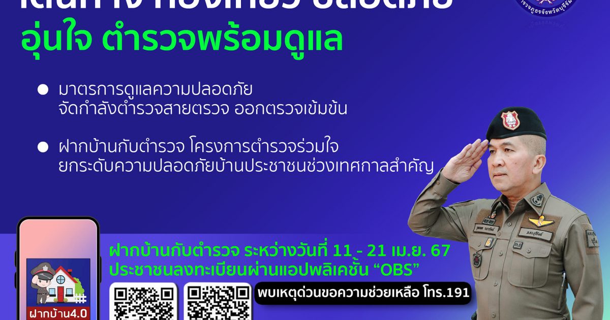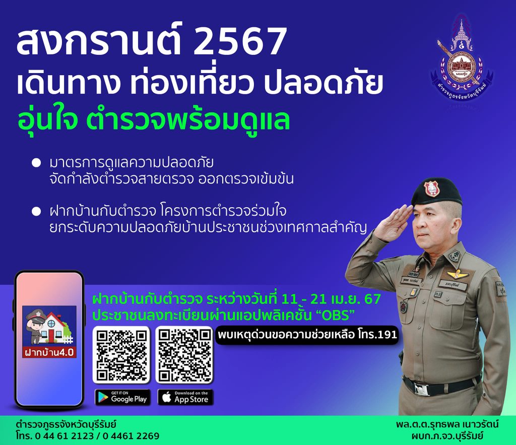 ฝากบ้านกับตำรวจ สงกรานต์ ปี 2567 10 เมษายน 2567 โดย admin / ข่าวประชาสัมพันธ์ สงกรานต์ ปี 2567 เดินทางท่องเที่ยว ปลอดภัย อุ่นใจ ตำรวจบุรีรัมย์พร้อมดูแล -มาตรการดูแลความปลอดภัย-ฝากบ้านกับตำรวจโครงการตำรวจร่วมใจ ยกระดับความปลอดภัยบ้านประชาชนช่วงเทศกาลสำคัญระหว่างวันที่ 11-12 เม.ย.67 ลงทะเบียนผ่านแอปพลิเคชั่น OBS