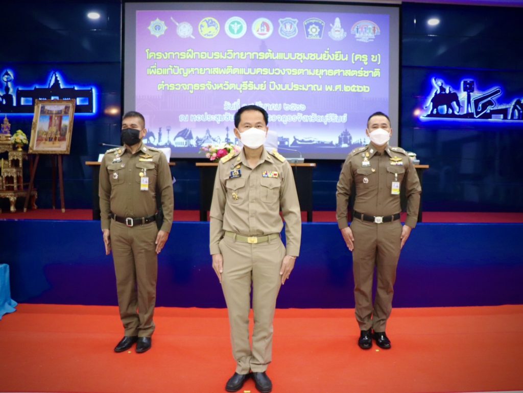 วันที่ 14 มีนาคม 2566 เวลา 09.30 น. นายปิยะ ปิจนำ รองผู้ว่าราชการจังหวัดบุรีรัมย์ , พ.ต.อ.วรายุส์ จันทร์เยี่ยม รอง ผบก.ฯ ปรก.ภ.จว.บุรีรัมย์ , พ.ต.อ.ก้องชาติ เลี้ยงสมทรัพย์ รอง ผบก.ภ.จว.บุรีรัมย์ พร้อมด้วยข้าราชการตำรวจในสังกัด ภ.จว.บุรีรัมย์, ฝ่ายปกครอง และฝ่ายสารธณสุข และผู้มีส่วนเกี่ยวข้อง ร่วมพิธีเปิดโครงการฝึกอบรมวิทยากรต้นแบบชุมชนยั่งยืน (ครู ข.) เพื่อแก้ปัญหายาเสพติดแบบครบวงจรตามยุทธศาสตร์ชาติ ประจำปีงบประมาณ พ.ศ.2566 โดยมี พล.ต.อ.ดำรงศักดิ์ กิตติประภัสร์ ผบ.ตร. เป็นประธานในพิธีฯ ผ่านระบบประชุมทางไกลผ่านจอภาพ (Zoom Meeting) ณ หอประชุมชัยจินดา ภ.จว.บุรีรัมย์
