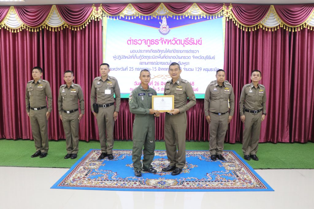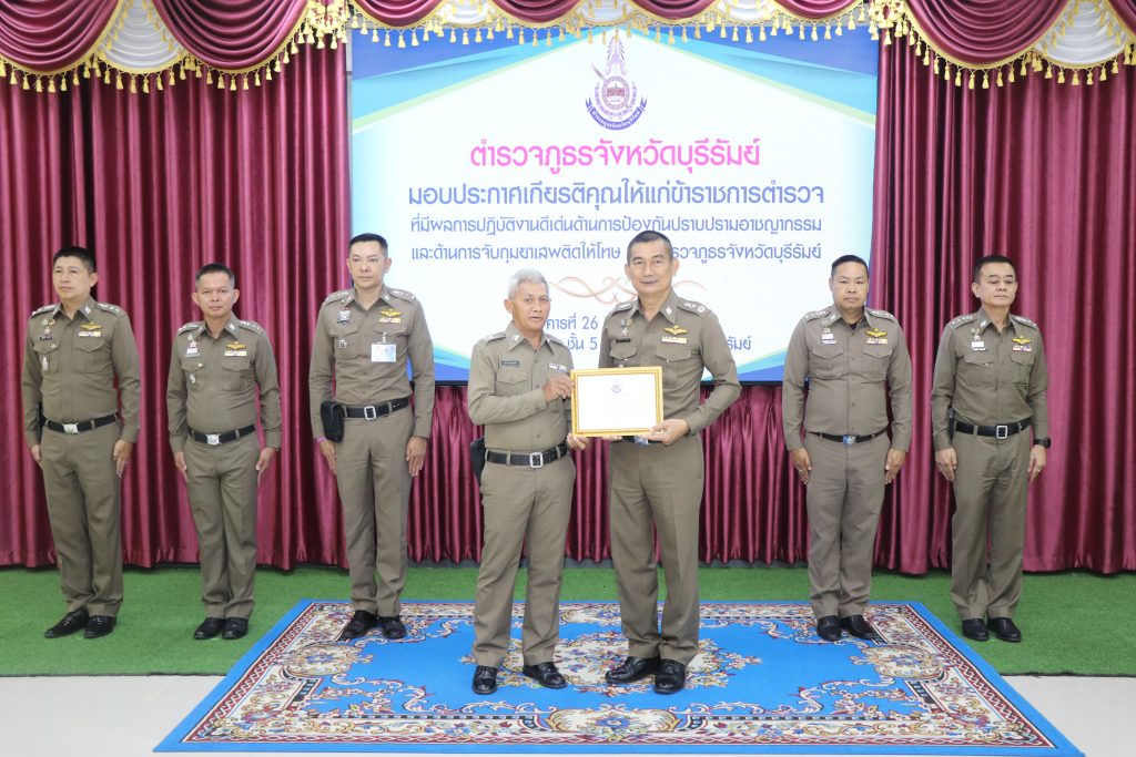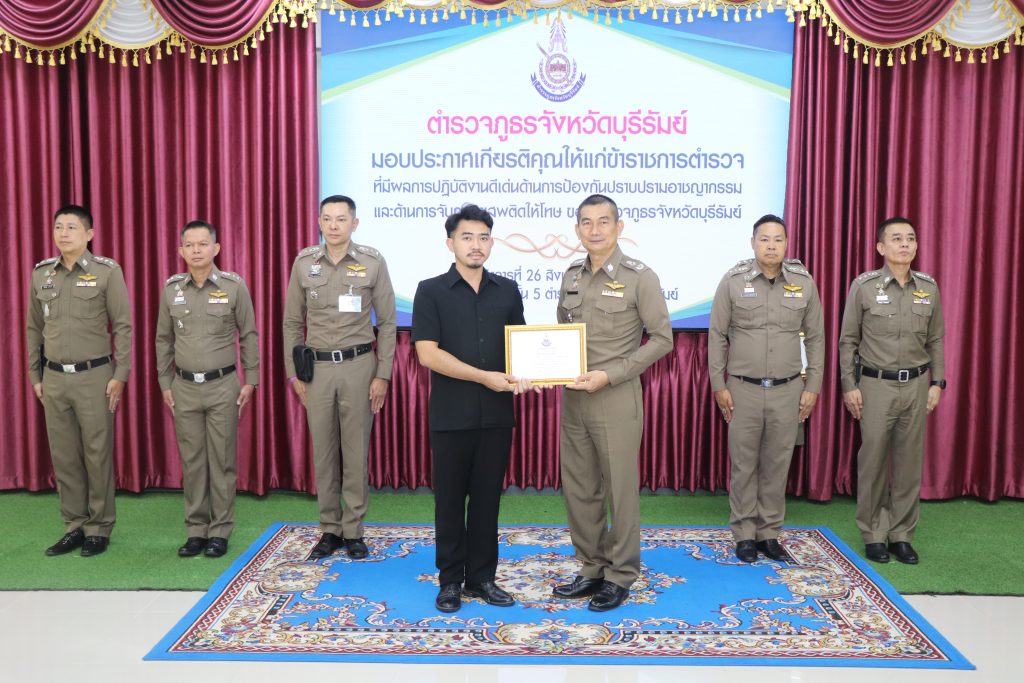 ร่วมพิธีมอบประกาศเกียรติคุณให้กับผู้มีผลปฏิบัติงานดีเด่นด้านป้องกันปราบอาชญากรรมและจับกุมยาเสพติด และมอบใบประกาศเกียรติคุณให้แก่ผู้ปฏิบัติงานเก็บกู้วัตถุระเบิดในพื้นที่อำเภอบ้านกรวด สถานการณ์ชายแดนไทย-กัมพูชา และประชุมบริหารตำรวจภูธรจังหวัดบุรีรัมย์ ประจำเดือนสิงหาคม 2568 ณ ห้องประชุมชั้น 5 ตำรวจภูธรจังหวัดบุรีรัมย์