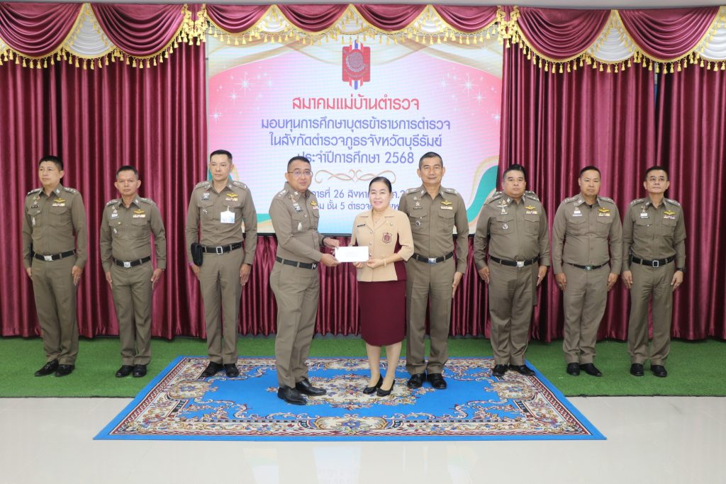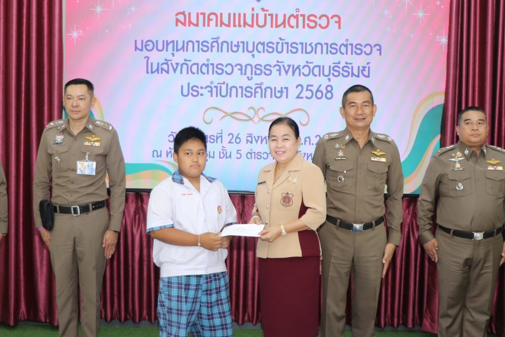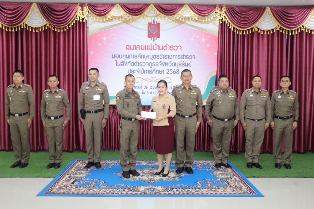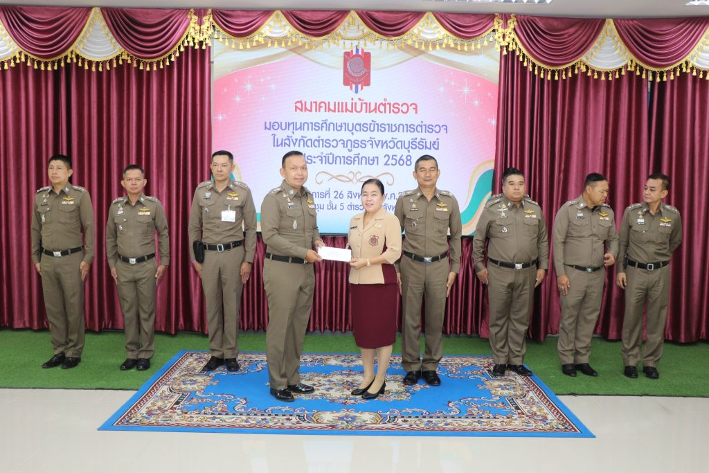 วันที่ 26 ส.ค. 68 เวลาประมาณ 10.00 น. พล.ต.ต.ณรงค์ศักดิ์ พรหมทา ผบก.ภ.จว.บุรีรัมย์ พร้อมด้วย คุณศิรินาถ จินดามณี ประธานแม่บ้านตำรวจภูธรจังหวัดบุรีรัมย์ , พ.ต.อ.ปริญญา พรเดชาพิพัฒ รอง ผบก.ภ.จว.บุรีรัมย์ , พ.ต.อ.ก้องชาติ เลี้ยงสมทรัพย์ รอง ผบก.ภ.จว.บุรีรัมย์ , พ.ต.อ.พงศ์พันษ์ พลวงษ์ศรี รอง ผบก.ภ.จว.บุรีรัมย์ , พ.ต.อ.เจตน์สฤษฎิ์ แพ่งศรีสาร รอง ผบก.ภ.จว.บุรีรัมย์ , พ.ต.อ.ชูสิทธิ์ หล่อแสง รอง ผบก.ภ.จว.บุรีรัมย์ , พ.ต.อ.อโณทัย จินดามณี รอง ผบก.ฯ ปฏิบัติราชการ รอง ผบก.ภ.จว.บุรีรัมย์ , พ.ต.อ.ศิริวัฒน์ สมกิจศิริ รอง ผบก.ภ.จว.บุรีรัมย์ , หัวน้าสถานีในสังกัด ภ.จว.บุรีรัมย์ และผู้ที่เกี่ยวข้อง ร่วมพิธีมอบทุนการศึกษาบุตรข้าราชการตำรวจในสังกัดตำรวจภูธรจังหวัดบุรีรัมย์ ประจำปีการศึก 2568 ณ ห้องประชุมชั้น 5 ตำรวจภูธรจังหวัดบุรีรัมย์