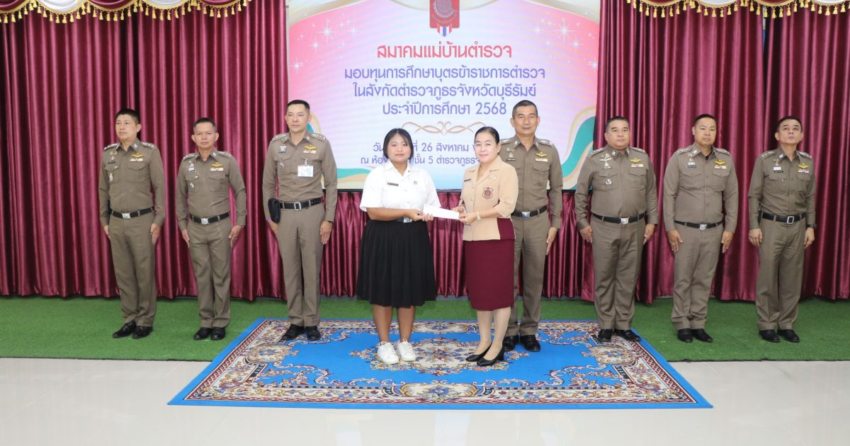 วันที่ 26 ส.ค. 68 เวลาประมาณ 10.00 น. พล.ต.ต.ณรงค์ศักดิ์ พรหมทา ผบก.ภ.จว.บุรีรัมย์ พร้อมด้วย คุณศิรินาถ จินดามณี ประธานแม่บ้านตำรวจภูธรจังหวัดบุรีรัมย์ , พ.ต.อ.ปริญญา พรเดชาพิพัฒ รอง ผบก.ภ.จว.บุรีรัมย์ , พ.ต.อ.ก้องชาติ เลี้ยงสมทรัพย์ รอง ผบก.ภ.จว.บุรีรัมย์ , พ.ต.อ.พงศ์พันษ์ พลวงษ์ศรี รอง ผบก.ภ.จว.บุรีรัมย์ , พ.ต.อ.เจตน์สฤษฎิ์ แพ่งศรีสาร รอง ผบก.ภ.จว.บุรีรัมย์ , พ.ต.อ.ชูสิทธิ์ หล่อแสง รอง ผบก.ภ.จว.บุรีรัมย์ , พ.ต.อ.อโณทัย จินดามณี รอง ผบก.ฯ ปฏิบัติราชการ รอง ผบก.ภ.จว.บุรีรัมย์ , พ.ต.อ.ศิริวัฒน์ สมกิจศิริ รอง ผบก.ภ.จว.บุรีรัมย์ , หัวน้าสถานีในสังกัด ภ.จว.บุรีรัมย์ และผู้ที่เกี่ยวข้อง ร่วมพิธีมอบทุนการศึกษาบุตรข้าราชการตำรวจในสังกัดตำรวจภูธรจังหวัดบุรีรัมย์ ประจำปีการศึก 2568 ณ ห้องประชุมชั้น 5 ตำรวจภูธรจังหวัดบุรีรัมย์