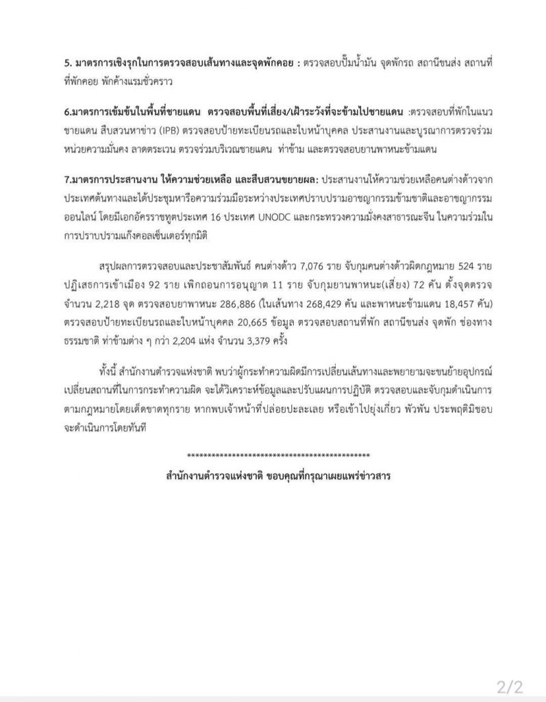 7.มาตรการประสานงาน ให้ความช่วยเหลือ และสืบสวนขยายผล: ประสานงานให้ความช่วยเหลือคนต่างด้าวจากประเทศต้นทางและได้ประชุมหารือความร่วมมือระหว่างประเทศปราบปรามอาชญากรรมข้ามชาติและอาชญากรรมออนไลน์ โดยมีเอกอัครราชทูตประเทศ 16 ประเทศ UNODC และกระทรวงความมั่งคงสาธารณะจีน ในความร่วมในการปราบปรามแก๊งคอลเซ็นเตอร์ทุกมิติ