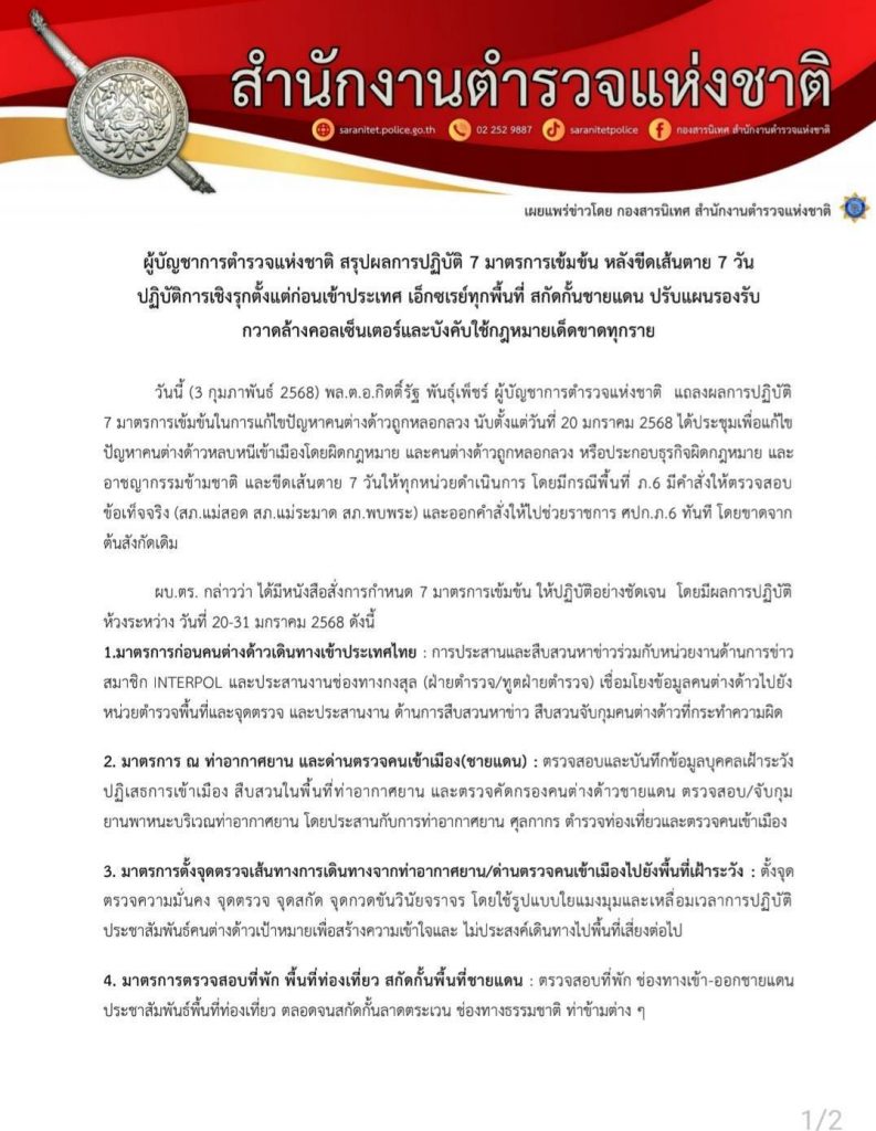 ผบ.ตร. สรุปผลการปฏิบัติ 7 มาตรการเข้มข้น หลังขีดเส้นตาย 7 วัน ปฏิบัติการเชิงรุกตั้งแต่ก่อนเข้าประเทศ เอ็กซเรย์ทุกพื้นที่ สกัดกั้นชายแดน ปรับแผนรองรับ