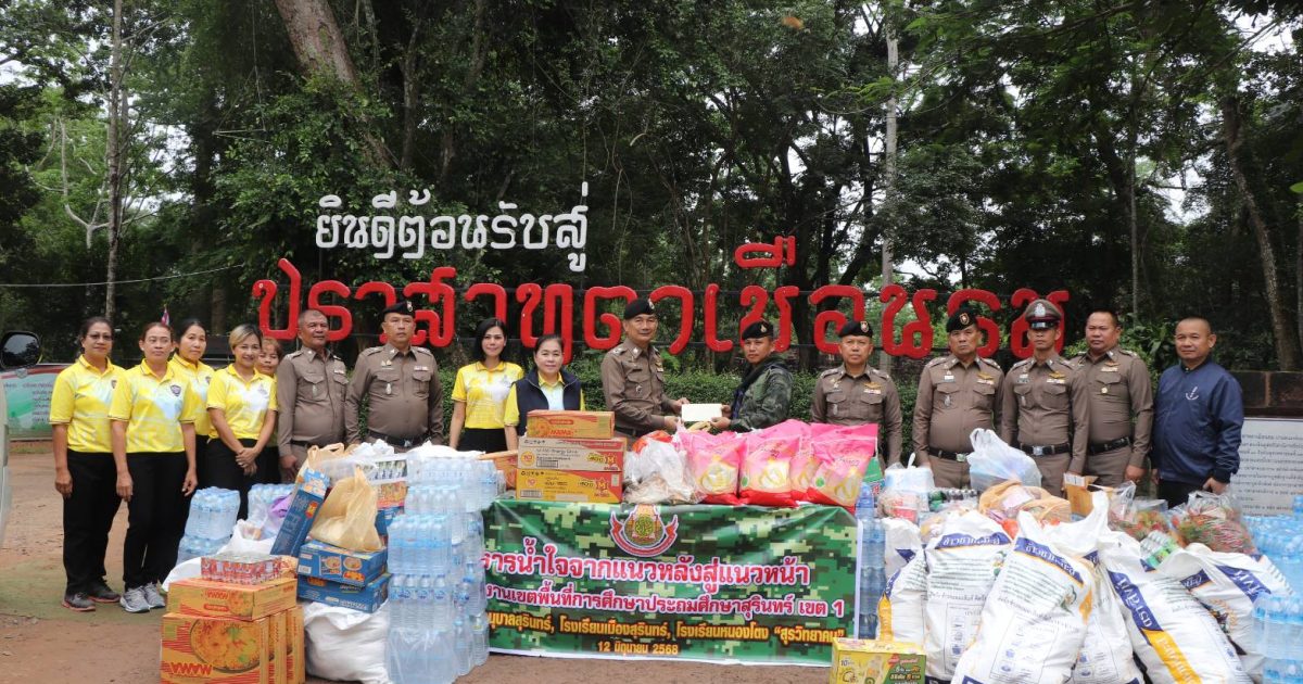 วันที่ 12 มิ.ย.68 เวลา 12.30 น. พล.ต.ต.ณรงค์ศักดิ์ พรหมทา ผบก.ภ.จว.บุรีรัมย์ พร้อมด้วย คุณศิรินาถ จินดามณี ประธานแม่บ้านตำรวจภูธรจังหวัดบุรีรัมย์ , พ.ต.อ.ธวัชชัย สร้อยสวัสดิ์ ผกก.สภ.บ้านกรวด , พ.ต.อ.มนัสวุฒิ บรรยงค์ ผกก.สภ.ละหานทราย , พ.ต.ท.ไกรสิทธิ์ หาญยิ่ง สวญ.สภ.โคกกระชาย , พ.ต.ท.ณรงฤทธิ์ ปานแดง สว.สภ.หนองไม้งาม หัวหน้าสถานีพื้นที่แนวเขตติดชายแดนไทย-กัมพูชา ร่วมเยี่ยมและมอบสิ่งบำรุงขวัญให้กำลังใจทหารที่อยู่ปฏิบัติหน้าที่ ณ ปราสาทตาเมือนธม อ.พนมดงรัก จ.สุรินทร์
