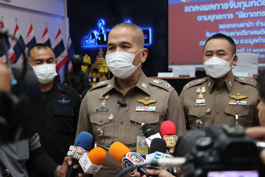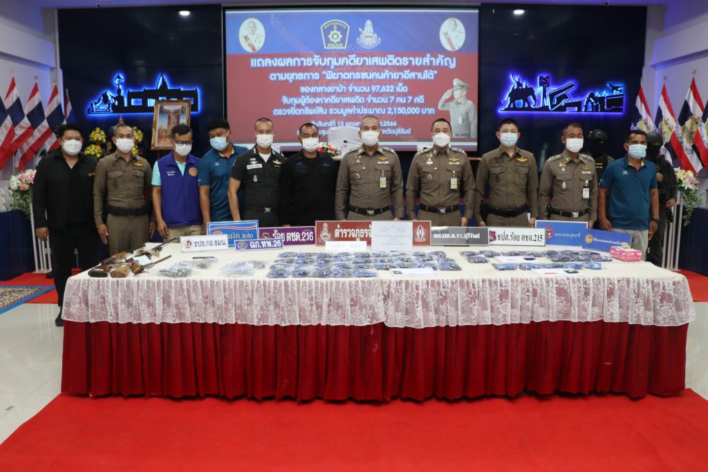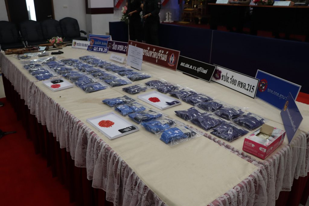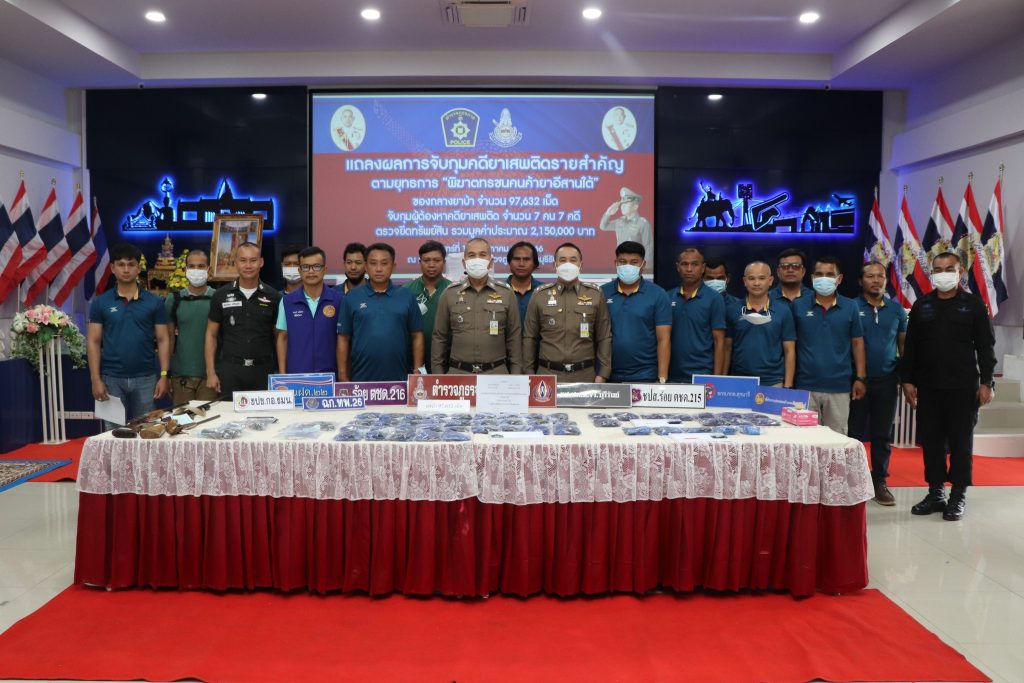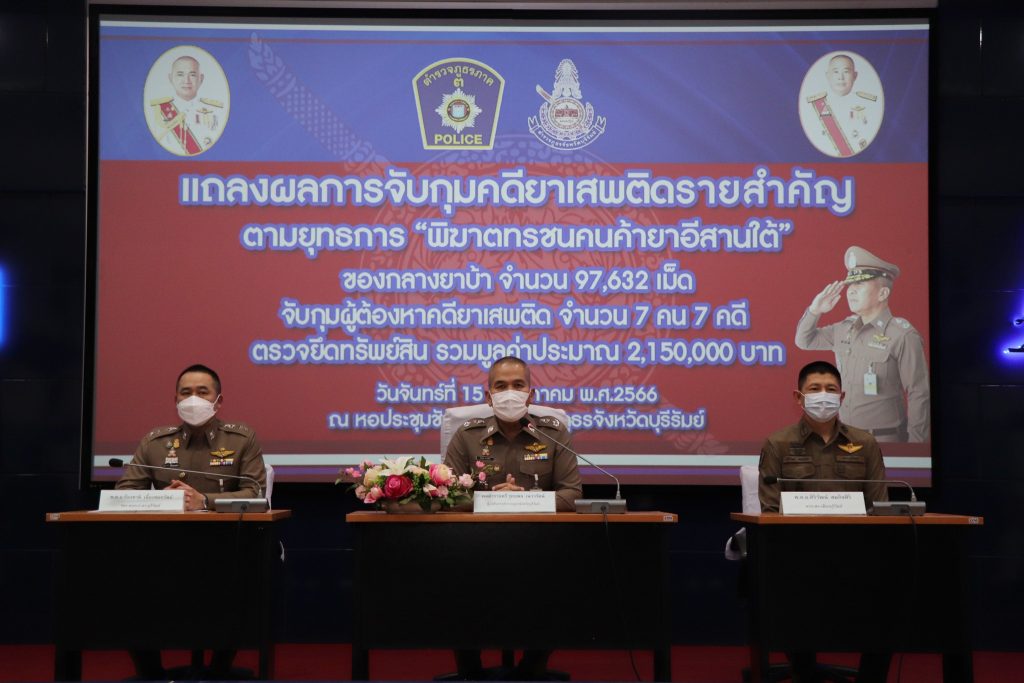 ร่วมแถลงผลการจับกุมคดียาเสพติด ตามยุทธการ “พิฆาตทรชนคนค้ายาอีสานใต้” ได้ทำลายเครือข่าย จำนวน 3 เครือข่าย จำนวน 7 คดี จับกุมผู้ต้องหา จำนวน 7 ราย ของกลาง ยาบ้า จำนวน 97,632 เม็ด, ยาไอซ์ นน. 1.82 กรัม, อาวุธปืน จำนวน 7 กระบอก, เครื่องกระสุนปืน จำนวน 33 นัด และตรวจยึดทรัพย์สินที่เกี่ยวเนื่องกับการกระทำความผิดเกี่ยวกับยาเสพติด ตามประมวลกฎหมายยาเสพติด ประกอบด้วย รถยนต์ จำนวน 3 คัน รถจักรยานยนต์ จำนวน 2 คัน รวมมูลค่าประมาณ 2,150,000 บาท ณ หอประชุมชัยจินดา ภ.จว.บุรีรัมย์ อ.เมือง จ.บุรีรัมย์