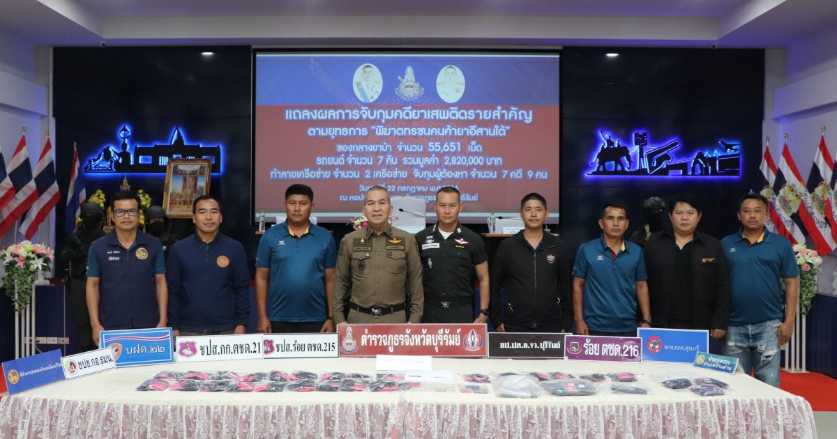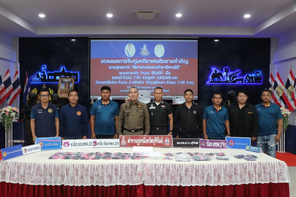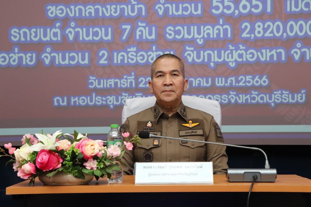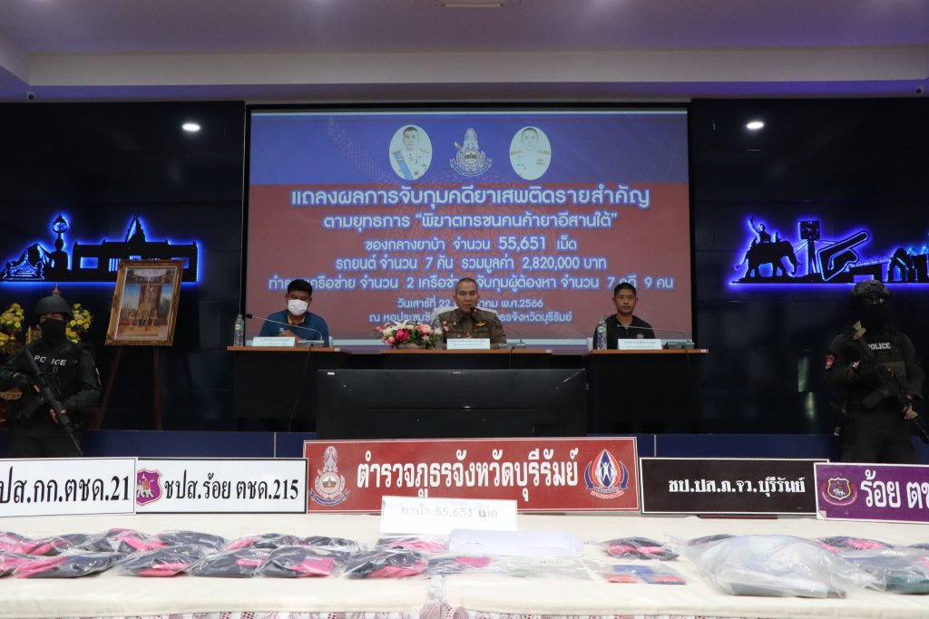 ร่วมแถลงผลการจับกุมคดียาเสพติด ตามยุทธการ “พิฆาตทรชนคนค้ายาอีสานใต้” ได้ทำลายเครือข่าย จำนวน 2 เครือข่าย จำนวน 7 คดี จับกุมผู้ต้องหา จำนวน 9 ราย ของกลาง ยาบ้า จำนวน 55,651 เม็ด และตรวจยึดทรัพย์สินที่เกี่ยวเนื่องกับการกระทำความผิดเกี่ยวกับยาเสพติด ตามประมวลกฎหมายยาเสพติด ประกอบด้วย รถยนต์ จำนวน 7 คัน รวมมูลค่าประมาณ 2,820,000 บาท ณ หอประชุมชัยจินดา ภ.จว.บุรีรัมย์ อ.เมือง จ.บุรีรัมย์