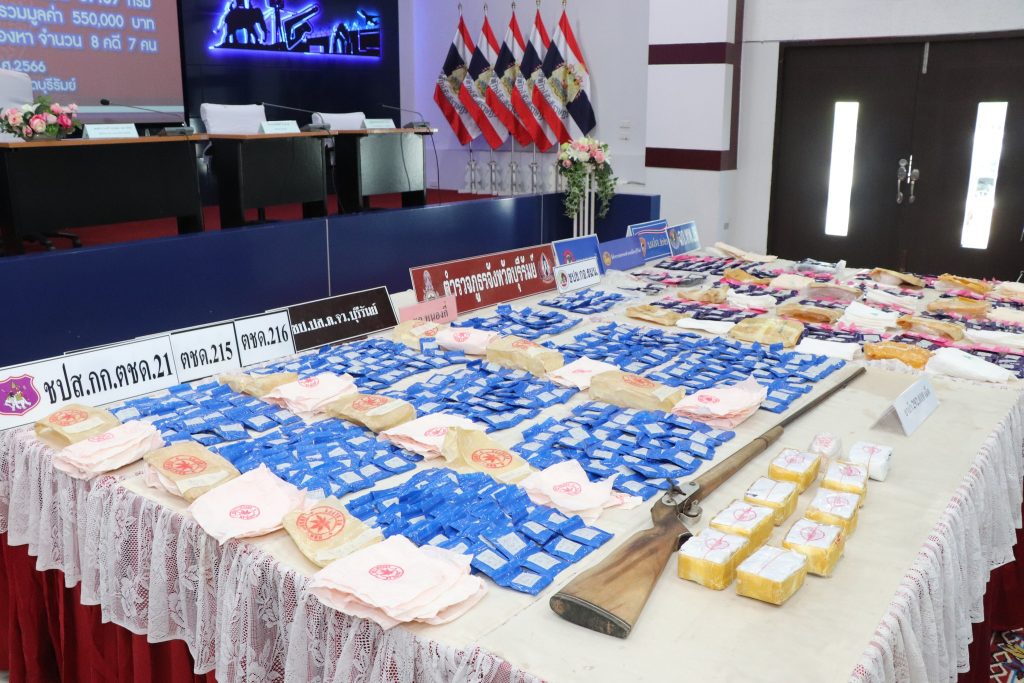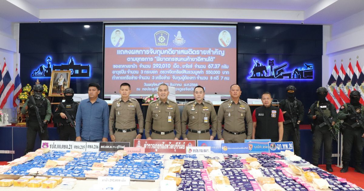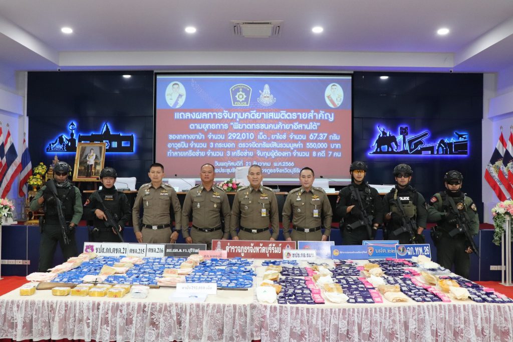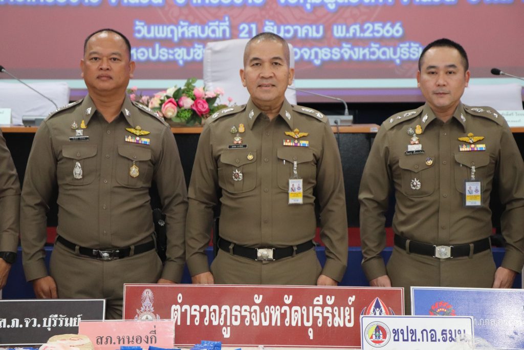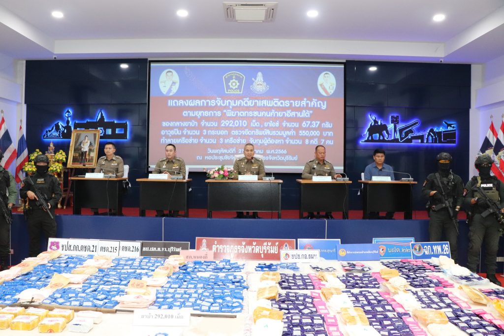 ร่วมแถลงผลการจับกุมคดียาเสพติด ตามยุทธการ “พิฆาตทรชนคนค้ายาอีสานใต้” ได้ทำลายเครือข่าย จำนวน 3 เครือข่าย จำนวน 8 คดี จับกุมผู้ต้องหา จำนวน 7 ราย ของกลาง ยาบ้า จำนวน 292,010 เม็ด, ยาไอซ์ 67.37 กรัม, อาวุธปืน 3 กระบอก, เครื่องกระสุนปืน จำนวน 9 นัด และตรวจยึดทรัพย์สินที่เกี่ยวเนื่องกับการกระทำความผิดเกี่ยวกับยาเสพติด ตามประมวลกฎหมายยาเสพติด ประกอบด้วย รถยนต์กระบะ จำนวน 1 คัน รถจักรยานยนต์ จำนวน 1 คัน รวมมูลค่า 550,000 บาท ณ หอประชุมชัยจินดา ภ.จว.บุรีรัมย์ อ.เมือง จ.บุรีรัมย์