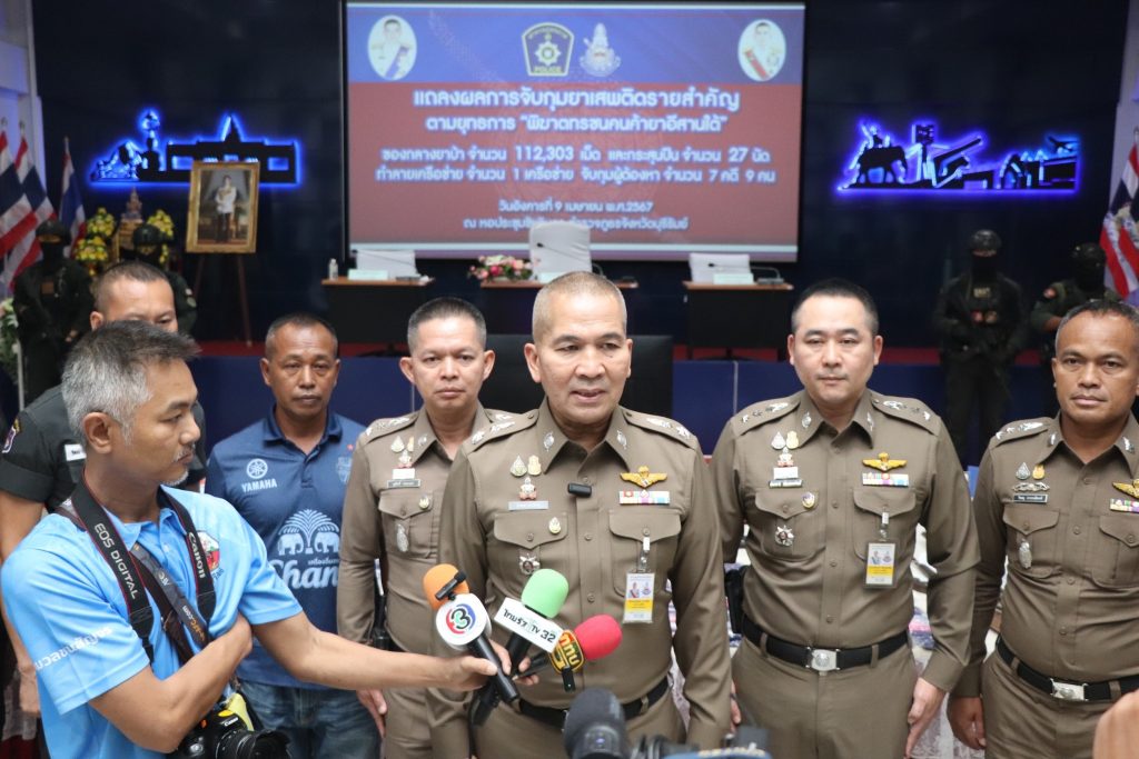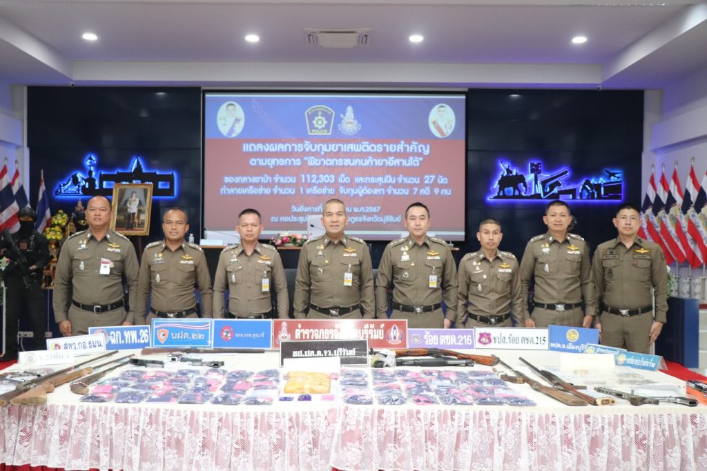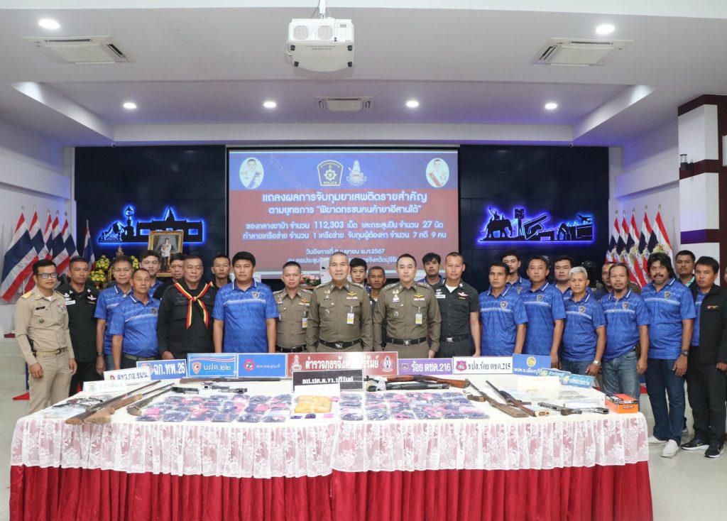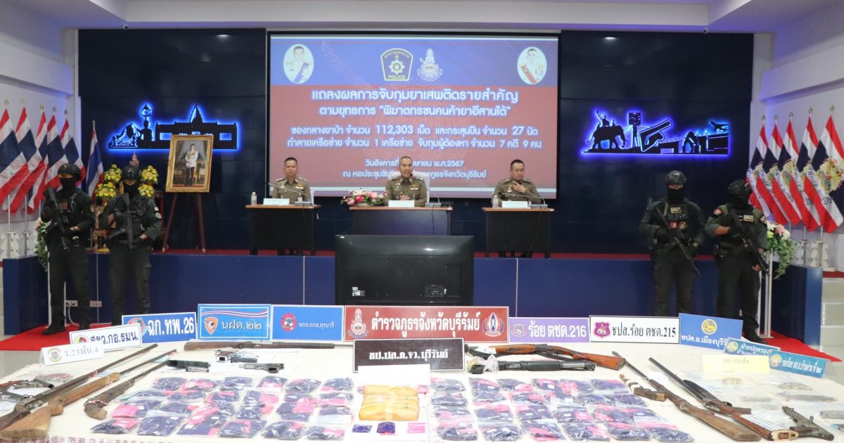 ร่วมแถลงผลการจับกุมคดียาเสพติด ตามยุทธการ “พิฆาตทรชนคนค้ายาอีสานใต้” ได้ทำลายเครือข่าย จำนวน 1 เครือข่าย จำนวน 7 คดี จับกุมผู้ต้องหา จำนวน 9 ราย ของกลาง ยาบ้า จำนวน 112,303 เม็ด, เครื่องกระสุนปืน และแถลงผลการปฏิบัติระดมกวาดล้างก่อนเทศกาลสงกรานต์ 2567 ห้วงระหว่างวันที่ 1-10 เม.ย. 67 ณ หอประชุมชัยจินดา ภ.จว.บุรีรัมย์ อ.เมือง จ.บุรีรัมย์
