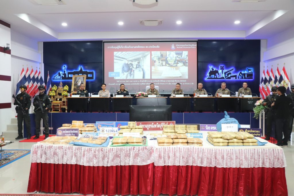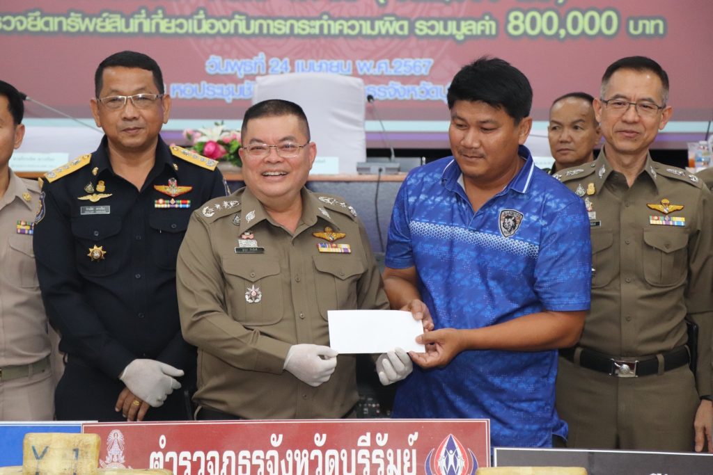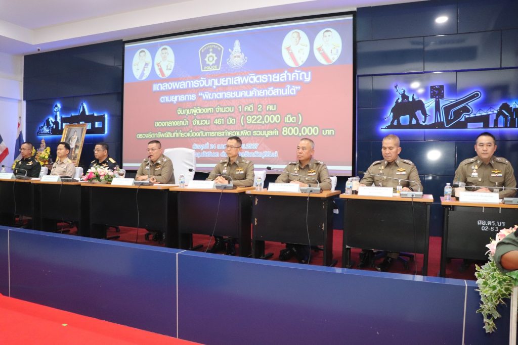 ร่วมแถลงผลการจับกุมคดียาเสพติด ตามยุทธการ “พิฆาตทรชนคนค้ายาอีสานใต้” ได้จับกุมผู้ต้องหา จำนวน 1 คดี ผู้ต้องหา 2 ราย ของกลาง ยาบ้า จำนวน 461 มัด (922,000 เม็ด) ตรวจยึดทรัพย์สินที่เกี่ยวเนื่องกับการกระทำความผิดเกี่ยวกับยาเสพติด ตามประมวลกฎหมายยาเสพติด ประกอบด้วย รถยนต์ 1 คัน รวมมูลค่าประมาณ 800,000 บาท ณ หอประชุมชัยจินดา ภ.จว.บุรีรัมย์ อ.เมือง จ.บุรีรัมย์