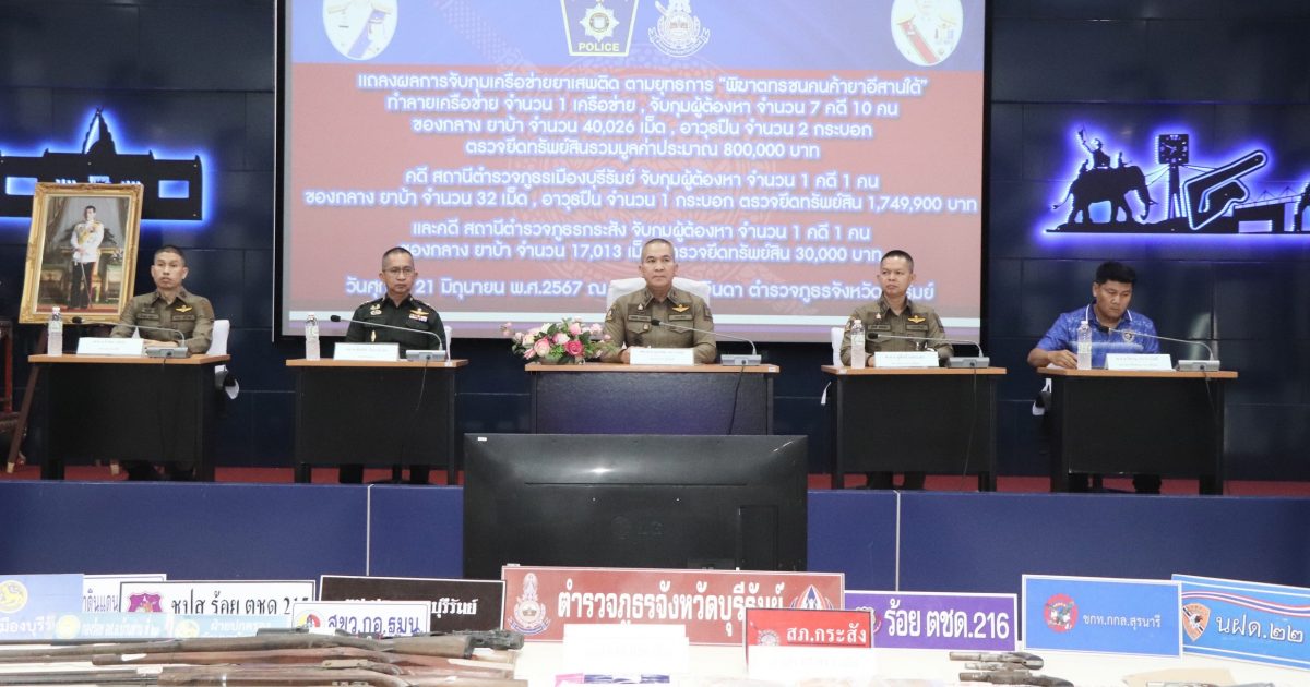 ร่วมแถลงผลการจับกุมคดียาเสพติด ตามยุทธการ “พิฆาตทรชนคนค้ายาอีสานใต้” ได้ทำลายเครือข่าย จำนวน 1 เครือข่าย จำนวน 9 คดี จับกุมผู้ต้องหา จำนวน 12 ราย ของกลาง ยาบ้า จำนวน 57,071 เม็ด, อาวุธปืน 2 กระบอก, อาวุธปืนลูกซองยาวอัตโนมัติพร้อมซองกระสุนบรรจุกระสุน 10 นัด 1 กระบอก, เครื่องกระสุนปืน 10 นัด ตรวจยึดทรัพย์สินที่เกี่ยวเนื่องกับการกระทำความผิดเกี่ยวกับยาเสพติด ตามประมวลกฎหมายยาเสพติด ประกอบด้วย รถยนต์ 3 คัน รถจักรยานยนต์ 2 คัน โทรศัพท์มือถือ 2 เครื่อง รวมมูลค่าประมาณ 2,579,900 บาท และแถลงผลการปฏิบัติระดมกวาดล้างอาชญากรรม ประจำเดือน มิถุนายน 2567 ห้วงระหว่างวันที่ 13 – 19 มิ.ย. 67 ณ หอประชุมชัยจินดา ภ.จว.บุรีรัมย์ อ.เมือง จ.บุรีรัมย์
