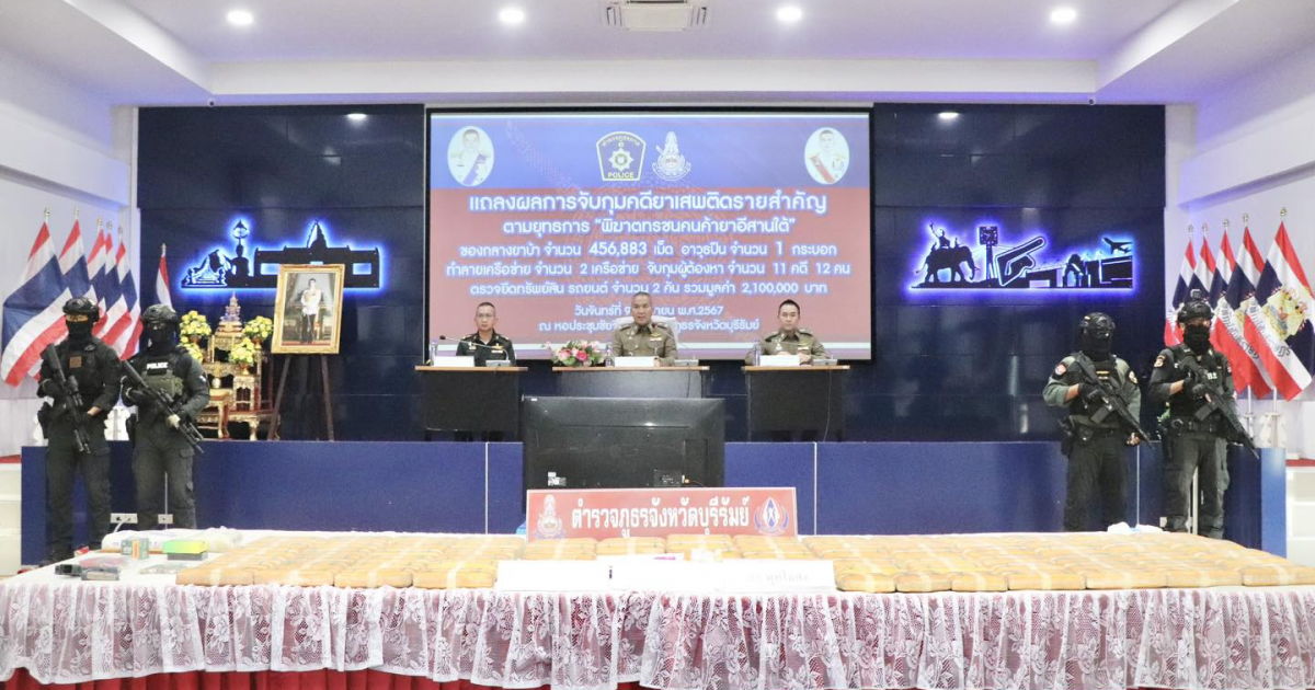 ร่วมแถลงผลการจับกุมคดียาเสพติด ตามยุทธการ “พิฆาตทรชนคนค้ายาอีสานใต้” ได้ทำลายเครือข่าย จำนวน 2 เครือข่าย จำนวน 11 คดี จับกุมผู้ต้องหา จำนวน 12 ราย ของกลาง ยาบ้า จำนวน 456,883 เม็ด, อาวุธปืน 1 กระบอก, เครื่องกระสุนปืน 90 นัด ได้ตรวจยึดทรัพย์สินที่เกี่ยวเนื่องกับการกระทำความผิดเกี่ยวกับยาเสพติด ตามประมวลกฎหมายยาเสพติด ประกอบด้วย รถยนต์ 2 คัน รวมมูลค่าประมาณ 2,100,000 บาท ณ หอประชุมชัยจินดา ภ.จว.บุรีรัมย์ อ.เมือง จ.บุรีรัมย์
