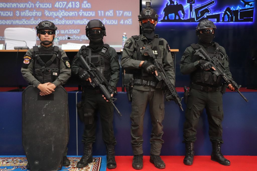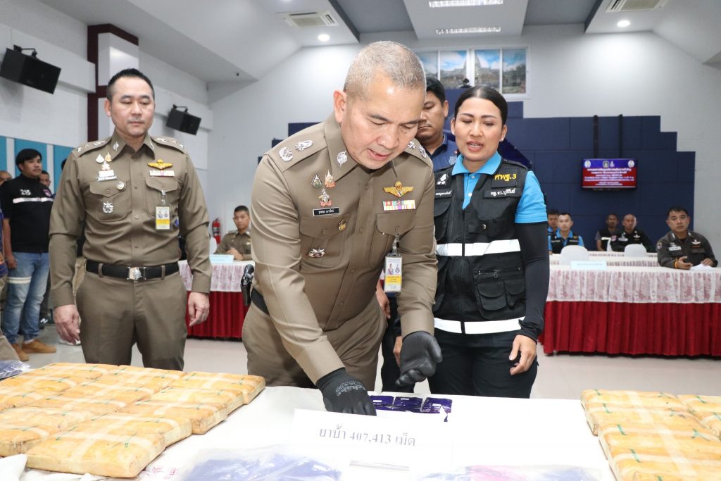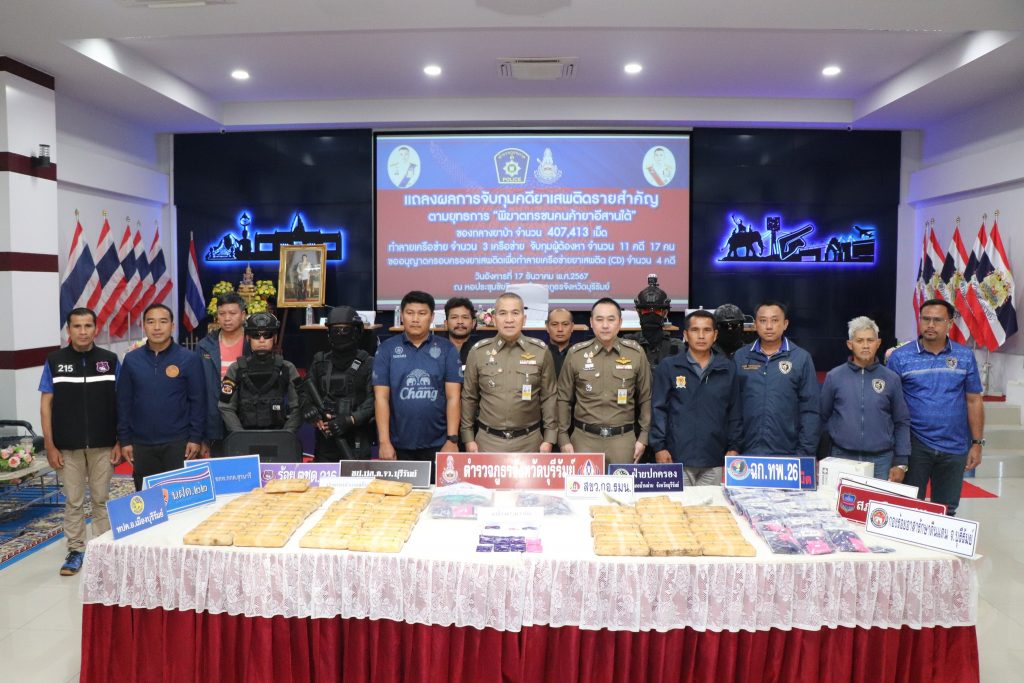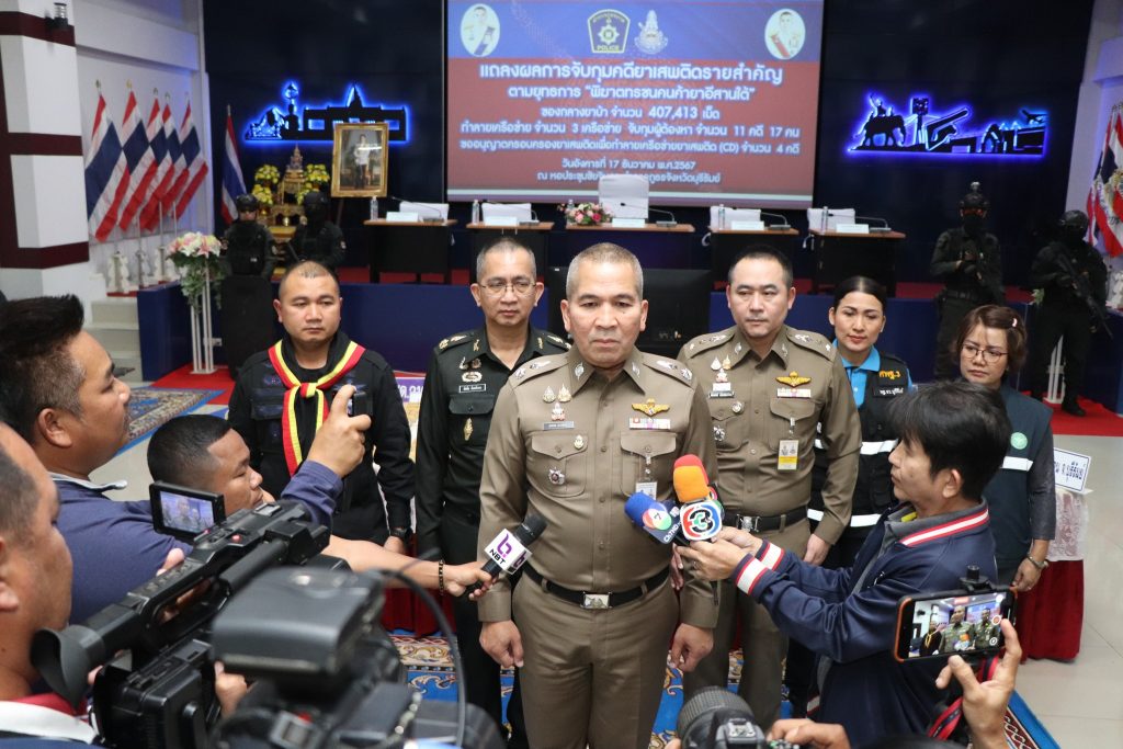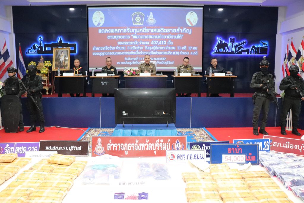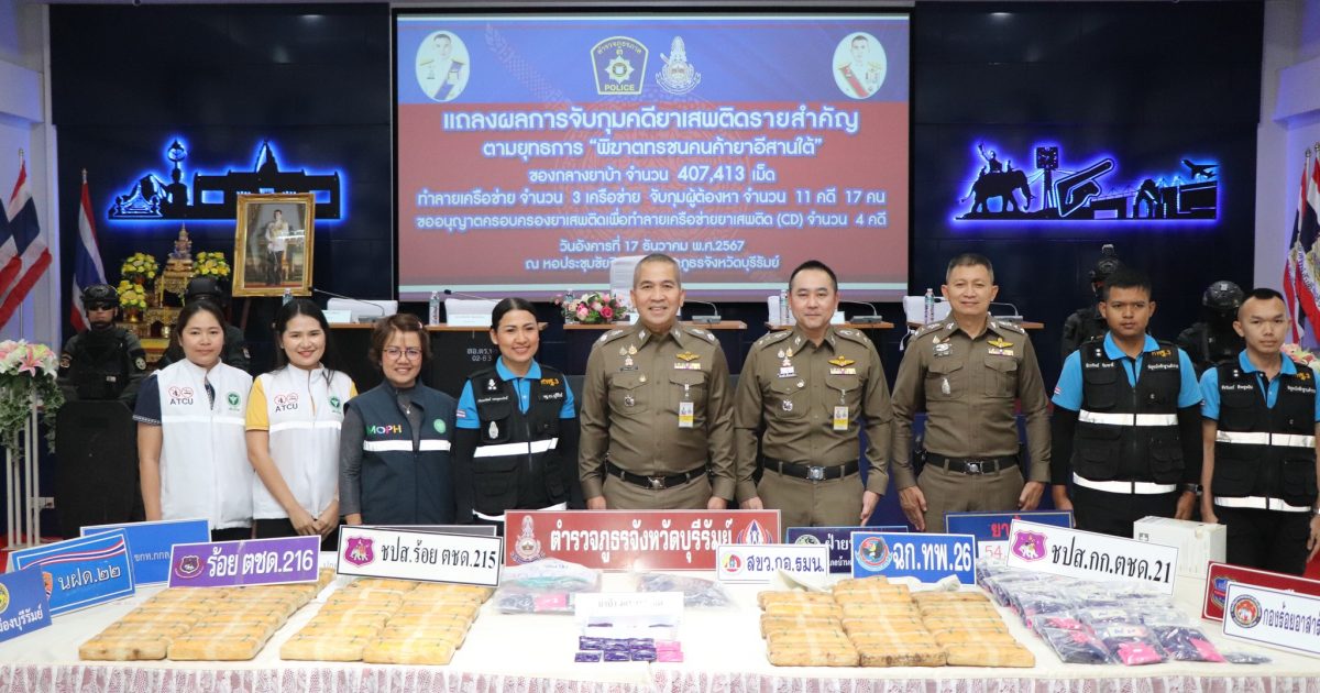 แถลงผลการจับกุมคดียาเสพติด ตามยุทธการ “พิฆาตทรชนคนค้ายาอีสานใต้” ได้ทำลายเครือข่าย จำนวน 3 เครือข่าย จำนวน 11 คดี จับกุมผู้ต้องหา จำนวน 17 ราย ของกลาง ยาบ้า จำนวน 407,413 เม็ด