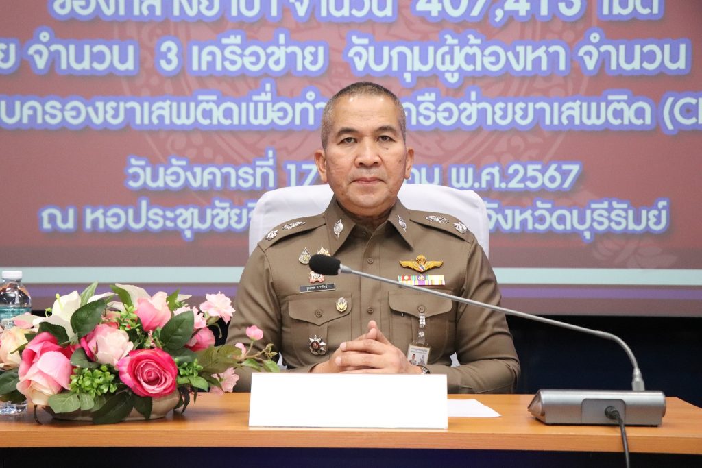 ร่วมแถลงผลการจับกุมคดียาเสพติด ตามยุทธการ “พิฆาตทรชนคนค้ายาอีสานใต้” ได้ทำลายเครือข่าย จำนวน 3 เครือข่าย จำนวน 11 คดี จับกุมผู้ต้องหา จำนวน 17 ราย ของกลาง ยาบ้า จำนวน 407,413 เม็ด ณ หอประชุมชัยจินดา ภ.จว.บุรีรัมย์ อ.เมือง จ.บุรีรัมย์