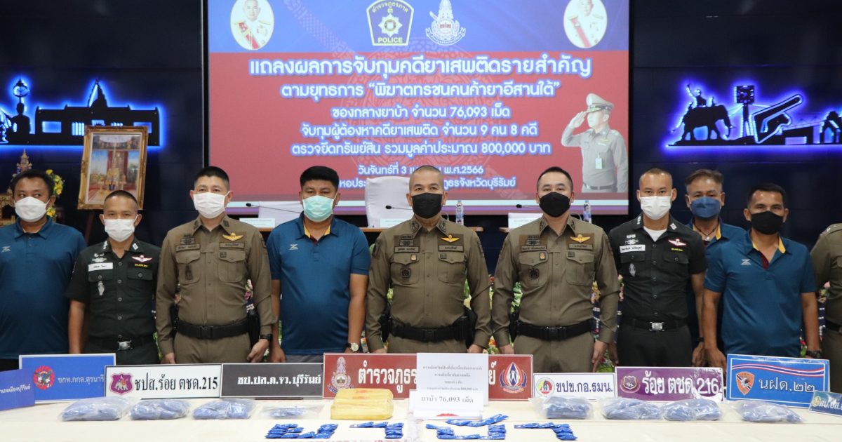 ร่วมแถลงผลการจับกุมคดียาเสพติด ตามยุทธการ “พิฆาตทรชนคนค้ายาอีสานใต้” ได้ทำลายเครือข่าย จำนวน 1 เครือข่าย จำนวน 8 คดี จับกุมผู้ต้องหา จำนวน 9 ราย ของกลาง ยาบ้า จำนวน 76,093 เม็ด และตรวจยึดทรัพย์สินที่เกี่ยวเนื่องกับการกระทำความผิดเกี่ยวกับยาเสพติด ตามประมวลกฎหมายยาเสพติด ประกอบด้วย รถยนต์ จำนวน 1 คัน รวมมูลค่าประมาณ 800,000 บาท ณ หอประชุมชัยจินดา ภ.จว.บุรีรัมย์ อ.เมือง จ.บุรีรัมย์