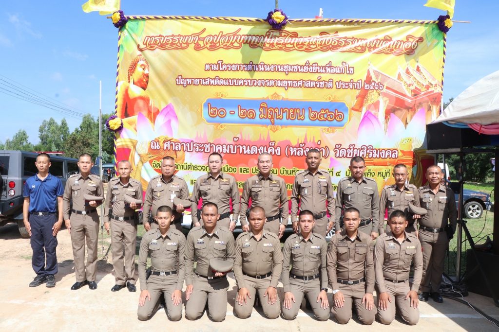 วันที่ 20 มิถุนายน 2566เวลา 09.00 น. พล.ต.ต.รุทธพล เนาวรัตน์ ผบก.ภ.จว.บุรีรัมย์ เดินทางมาตรวจเยี่ยม โครงการชุมชนยั่งยืนเพื่อแก้ไขปัญหายาเสพติดแบบครบวงจรตามยุทธศาสตร์ชาติของ สภ.คูเมือง และเป็นประธานในพิธีบรรพชา – อุปสมบทหมู่โครงการแสงธรรมแผ่นดินทอง ตามโครงการดำเนินงานชุมชนยั่งยืนเพื่อแก้ไขปัญหายาเสพติดแบบครบวงจรตามยุทธศาสตร์ชาติ ประจำปี 2566 โดยมี พ.ต.อ.ก้องชาติ เลี้ยงสมทรัพย์ รอง ผบก.ภ.จว.บุรีรัมย์, พ.ต.อ.อัษฎไณย ป้องกัน ผกก.สภ.คูเมือง, ผู้นำชุมชน, ผู้เข้าร่วมโครงการฯ และประชาชนในพื้นที่ เข้าร่วมพิธีฯ ณ ศาลาประชาคม บ้านดงเค็ง ม.5 ต.หนองขมาร อ.คูเมือง จว.บุรีรัมย์