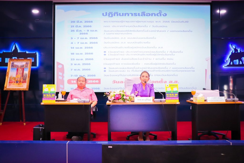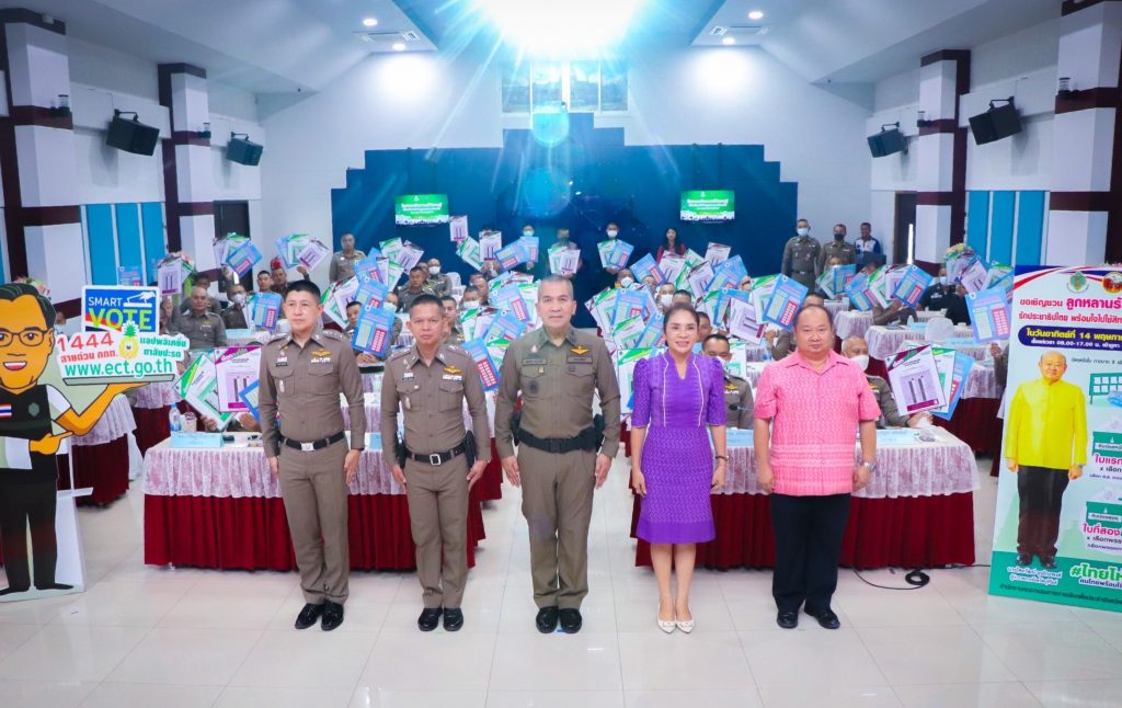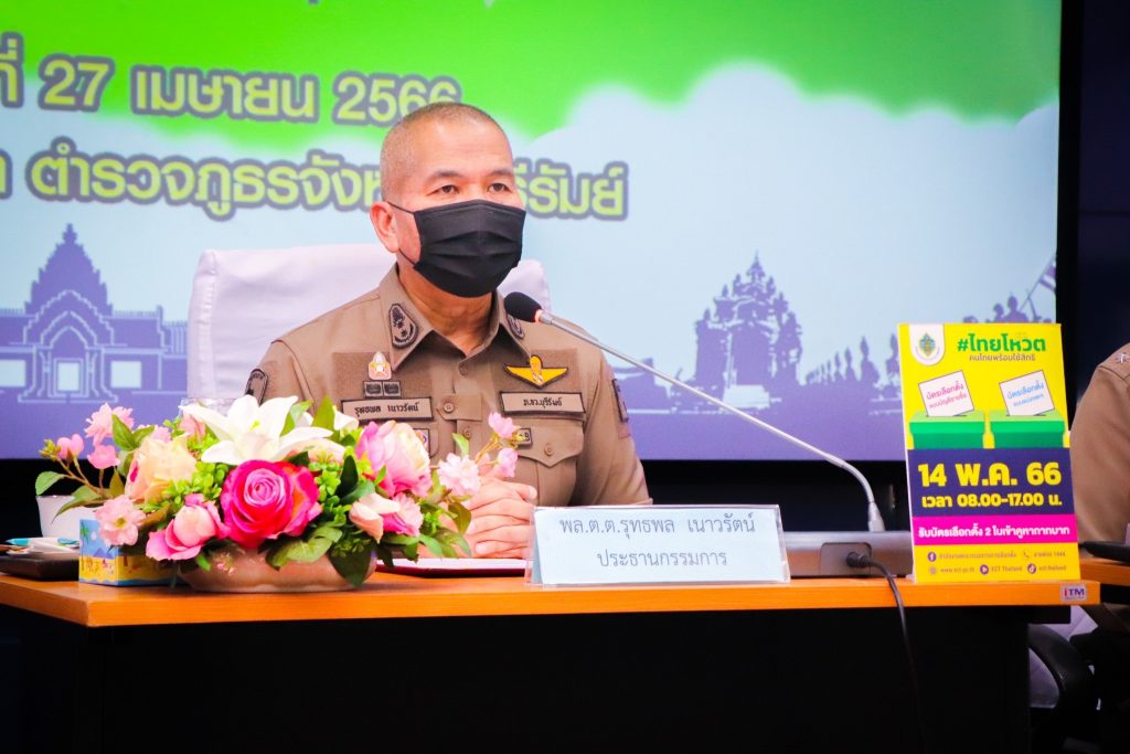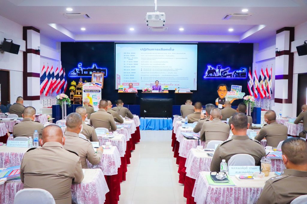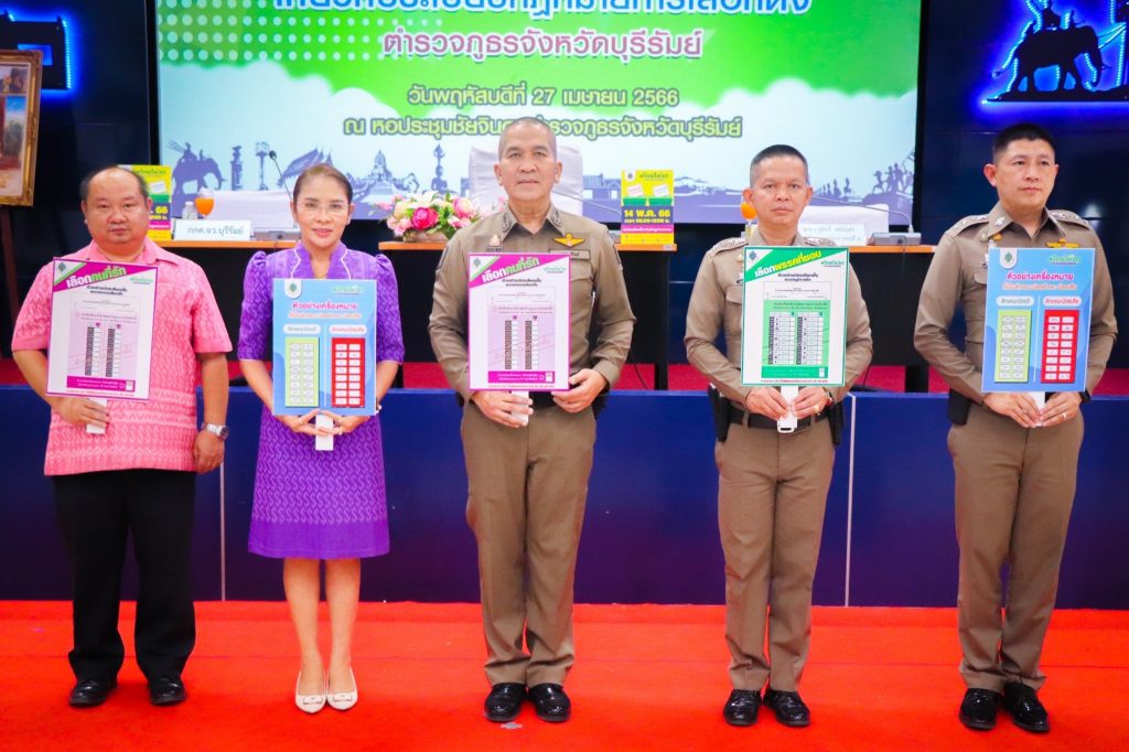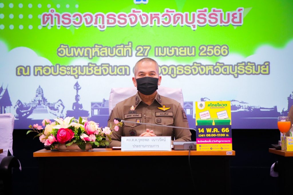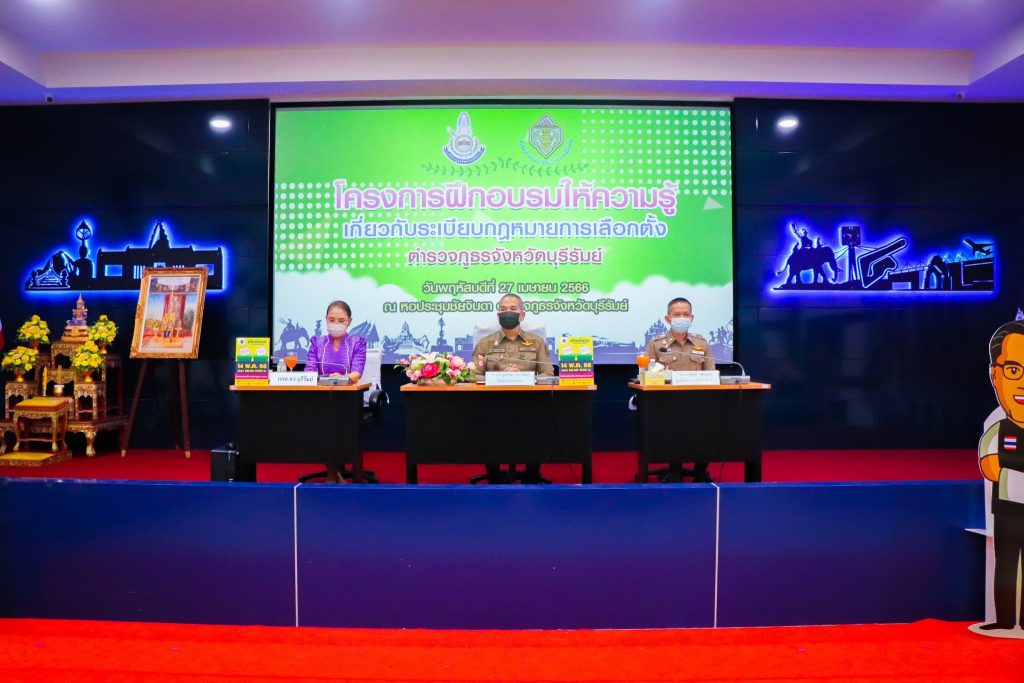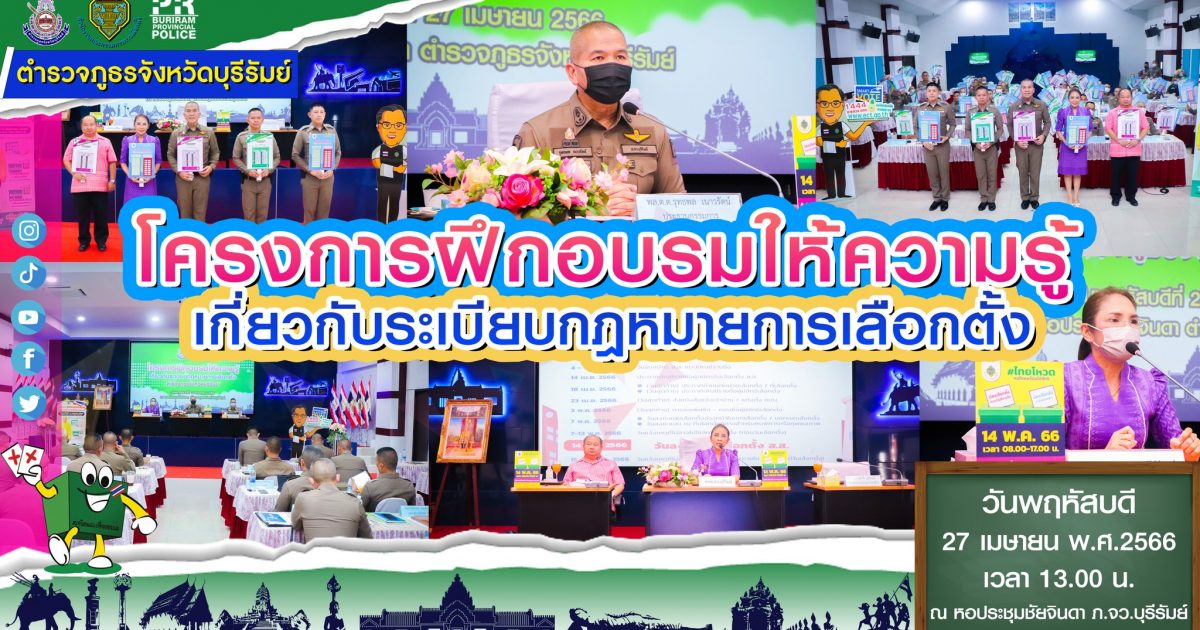 วันที่ 27 เมษายน2566 เวลา 13.30 น. พล.ต.ต.รุทธพล เนาวรัตน์ ผบก.ภ.จว.บุรีรัมย์ เป็นประธานในพิธี พร้อมด้วย ผอ.กกต.จว.บุรีรัมย์, รอง ผบก.ภ.จว.บุรีรัมย์, คณะวิทยากร และผู้เข้ารับการฝึกอบรม ร่วมพิธีเปิดโครงการฝึกอบรมให้ความรู้เกี่ยวกับระเบียบกฎหมายการเลือกตั้ง ตำรวจภูธรจังหวัดบุรีรัมย์ ณ หอประชุมชัยจินดา ภ.จว.บุรีรัมย์ อ.เมือง จ.บุรีรัมย์