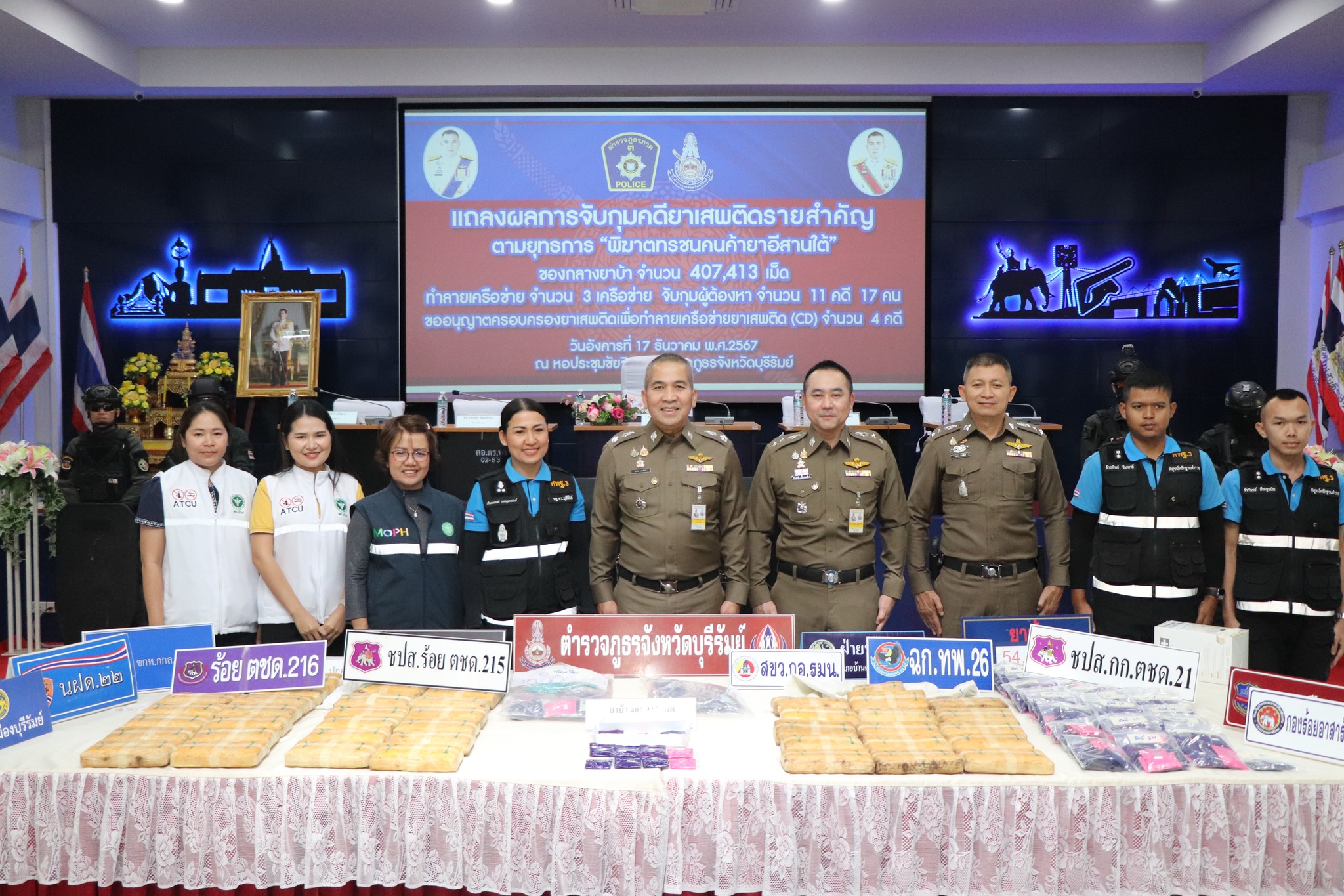 แถลงผลการจับกุมคดียาเสพติด ตามยุทธการ “พิฆาตทรชนคนค้ายาอีสานใต้” ได้ทำลายเครือข่าย จำนวน