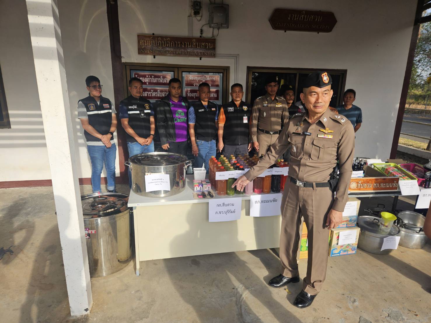 พล.ต.ต.ณรงค์ศักดิ์ พรหมทา ผบก.ภ.จว.บุรีรัมย์ แถลงผลการจับกุมผู้ลักลอบจำหน่ายน้ำกระท่อมและบุหรี่ไฟฟ้า