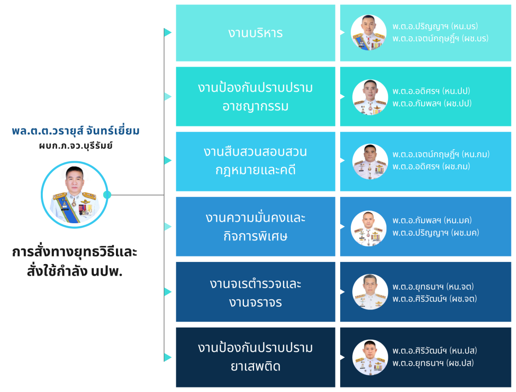 - การดำเนินการเกี่ยวกับการเสนอแนะนโยบาย กำหนดยุทธศาสตร์ วางแผนทำโครงการ ตลอดจนควบคุม กำกับ ดูแลแผนความมั่นคงภายในพื้นที่ของตำรวจภูธรจังหวัดบุรีรัมย์