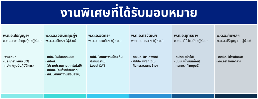 - จัดเตรียมข้อมูลด้านกฎหมายต่างๆ เพื่อสนับสนุนการตัดสินใจให้แก่ผู้บังคับบัญชา