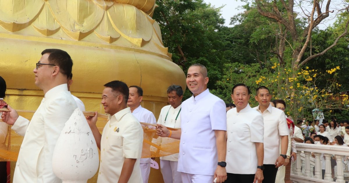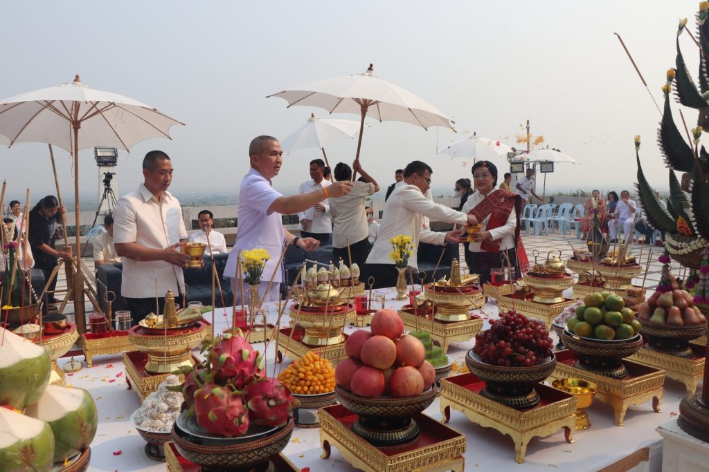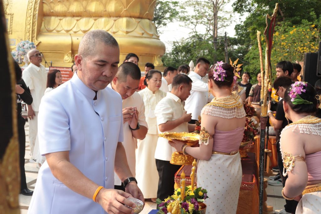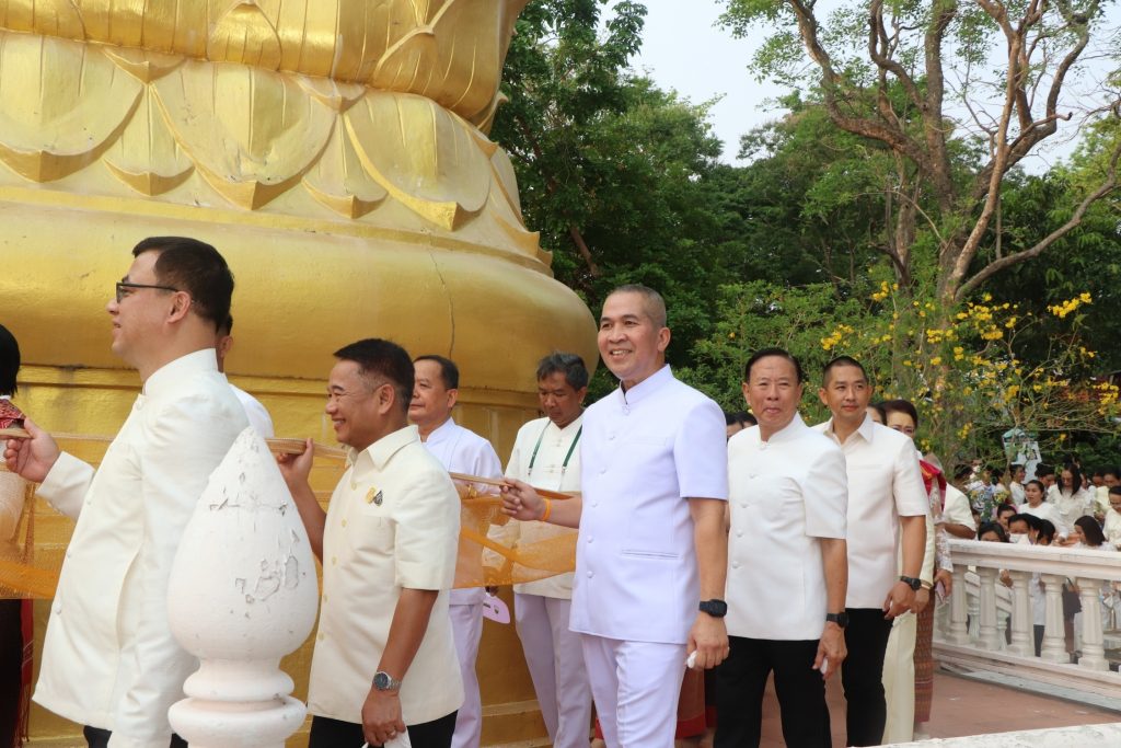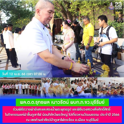 วันที่ 12 เมษายน 2566 เวลา 07.00 น. พล.ต.ต.รุทธพล เนาวรัตน์ ผบก.ภ.จว.บุรีรัมย์ พร้อมด้วย พ.ต.อ.ศิริวัฒน์ สมกิจศิริ ผกก.สภ.เมืองบุรีรัมย์ ร่วมพิธีถวายผ้าอังสะและสรงน้ำพระพุทธรูป และพิธีบวงสรวงสิ่งศักดิ์สิทธิ์ ใน กิจกรรมแห่ผ้าขึ้นภูเขาไฟ น้อมใจไหว้พระใหญ่ ไปเที่ยวลานวัฒนธรรม ประจำปี 2566 โดยมี นายไชยวัฒน์ จุนถิระพงศ์ ผวจ.บุรีรัมย์ เป็นประธาน ณ เขตห้ามล่าสัตว์ป่าภูเขาไฟ กระโดง อ.เมือง จ.บุรีรัมย์